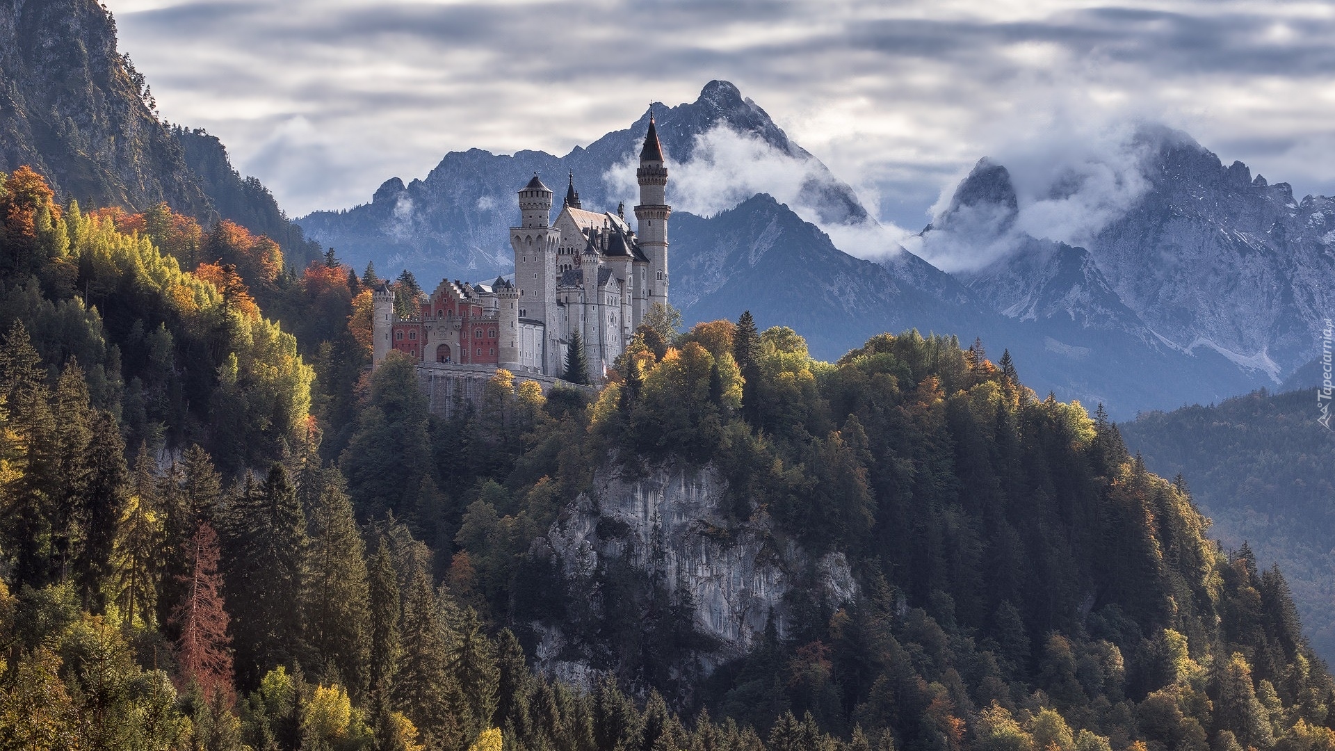 Edytor tapety: Zamek Neuschwanstein na skałach i góry we mgle