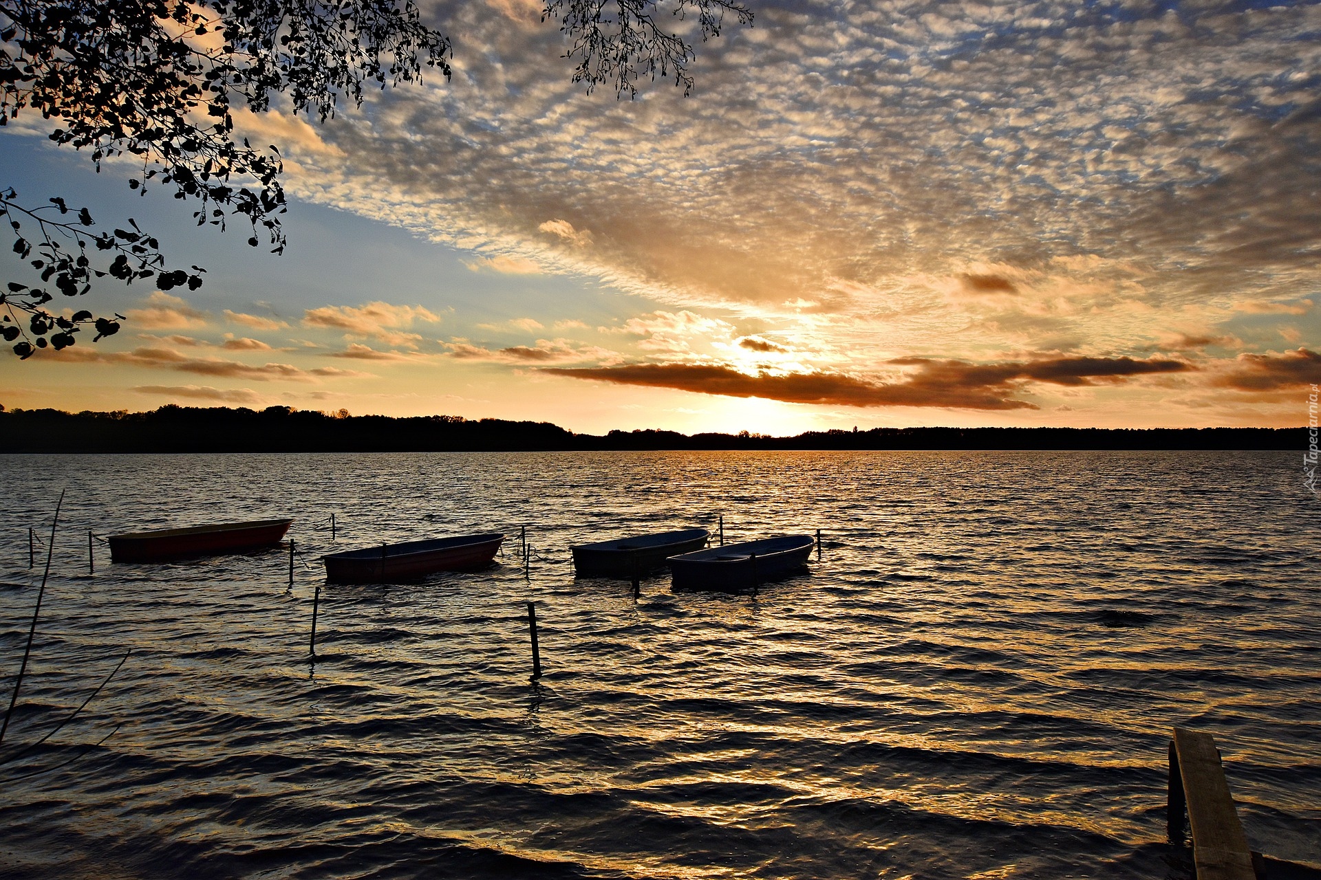 Edytor tapety: Łodzie zacumowane na jeziorze o zmierzchu