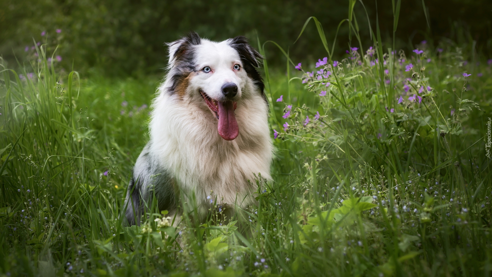 Edytor tapety: Owczarek australijski w trawie z wywieszonym językiem