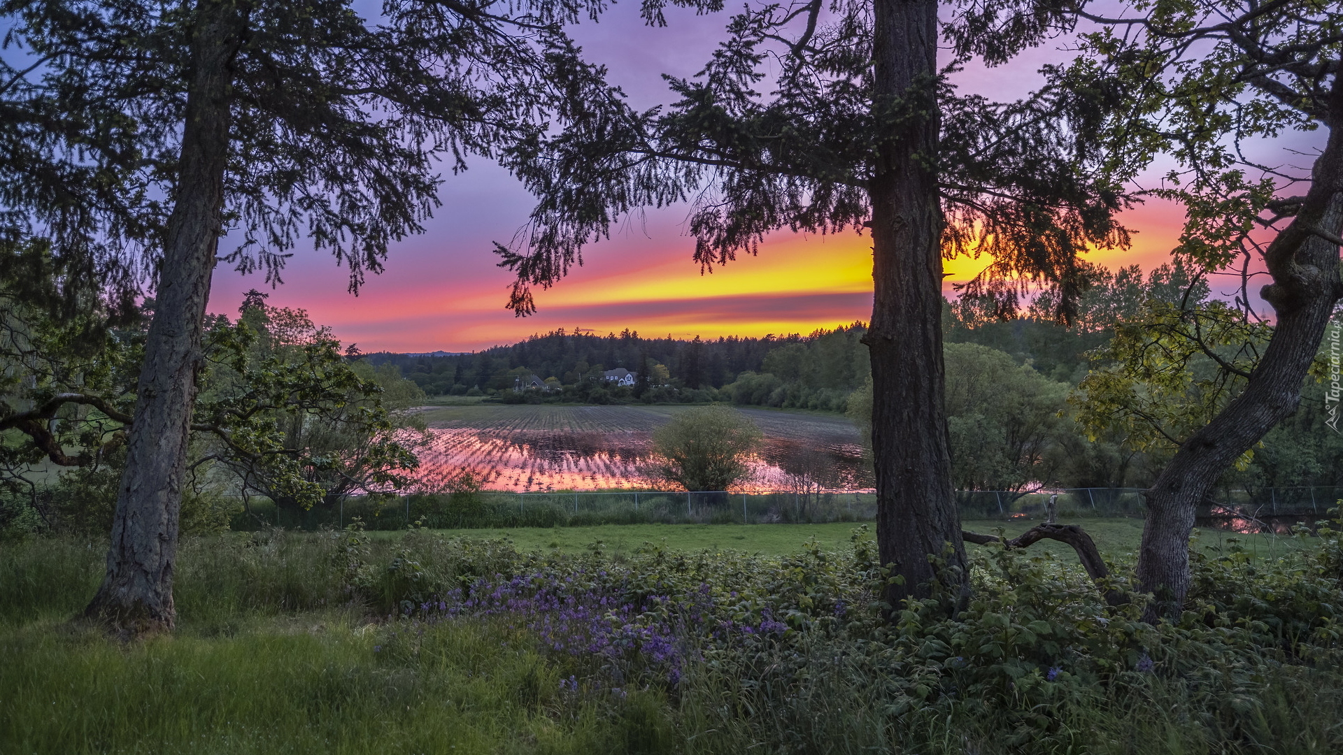 Edytor tapety: Drzewa na tle zalanego pola o zachodzie słońca