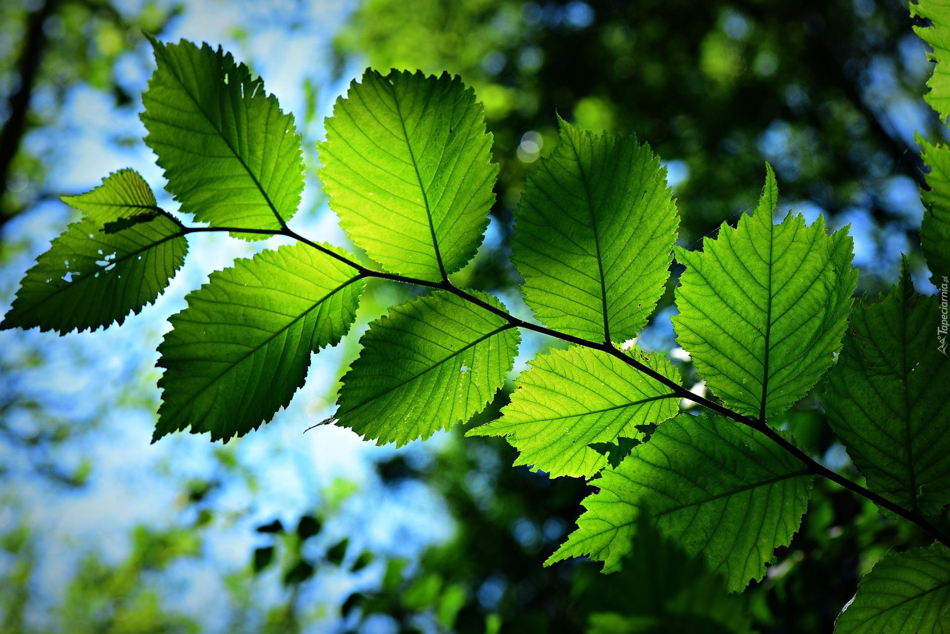 Edytor tapety: Rozświetlona słońcem gałązka z zielonymi liśćmi