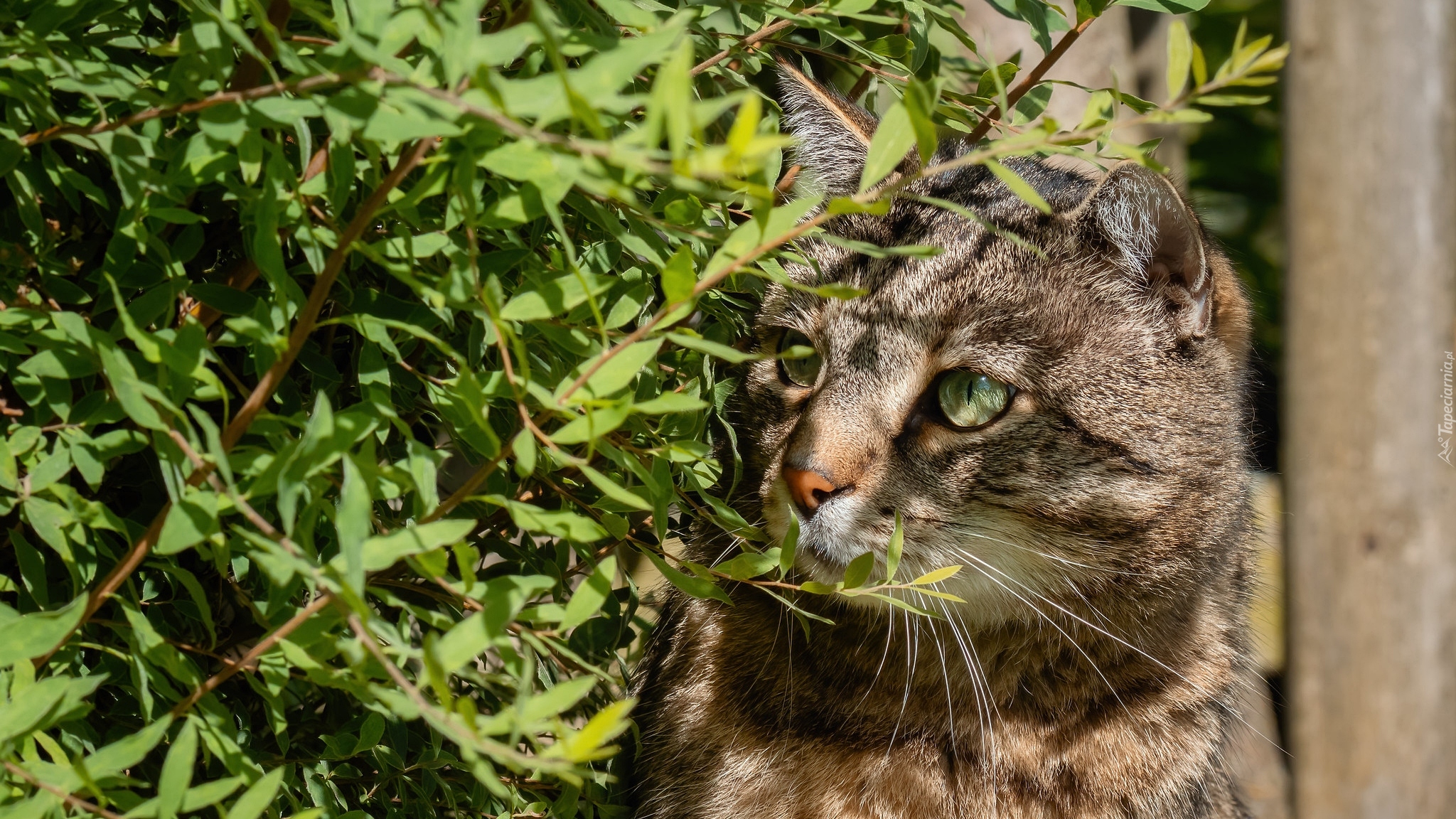 Edytor tapety: Bury kot przy gałązce z liśćmi