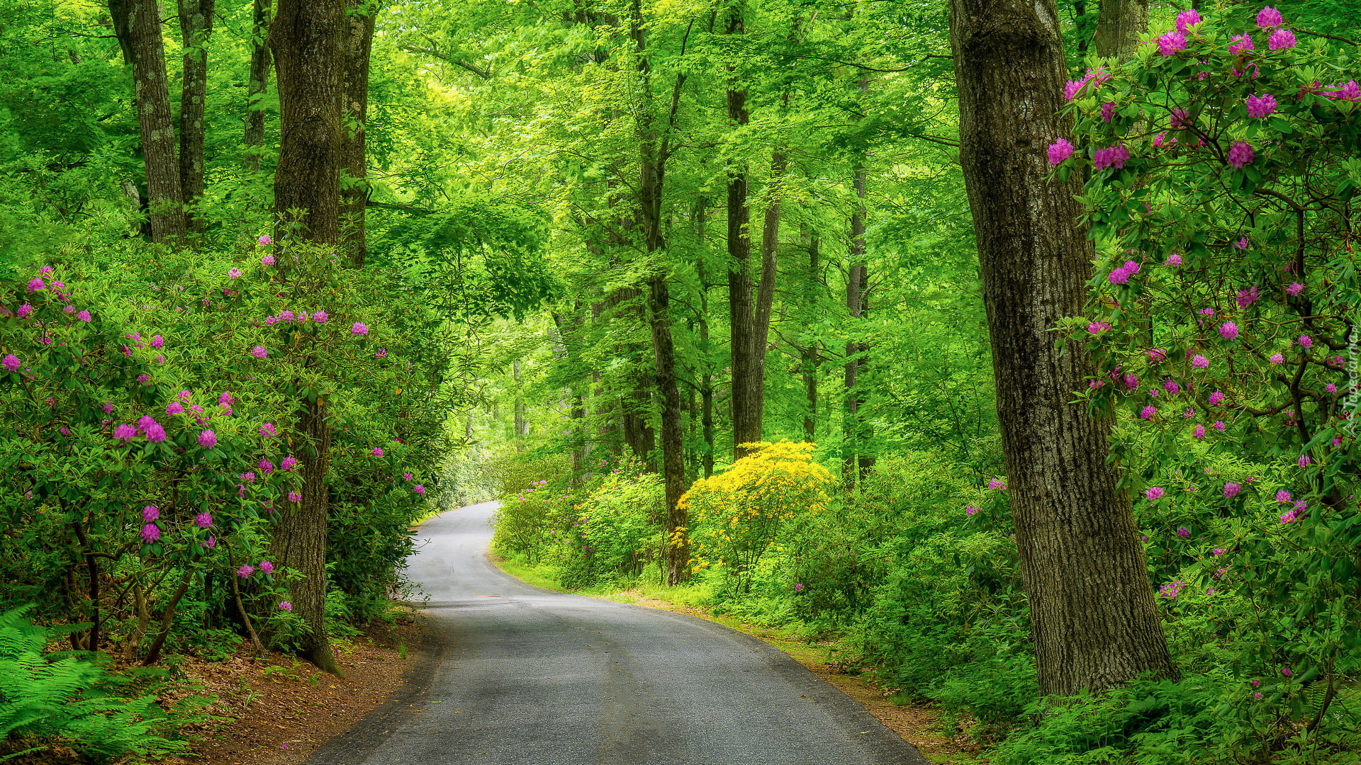 Edytor tapety: Kwitnące różaneczniki i zielone drzewa przy leśnej drodze
