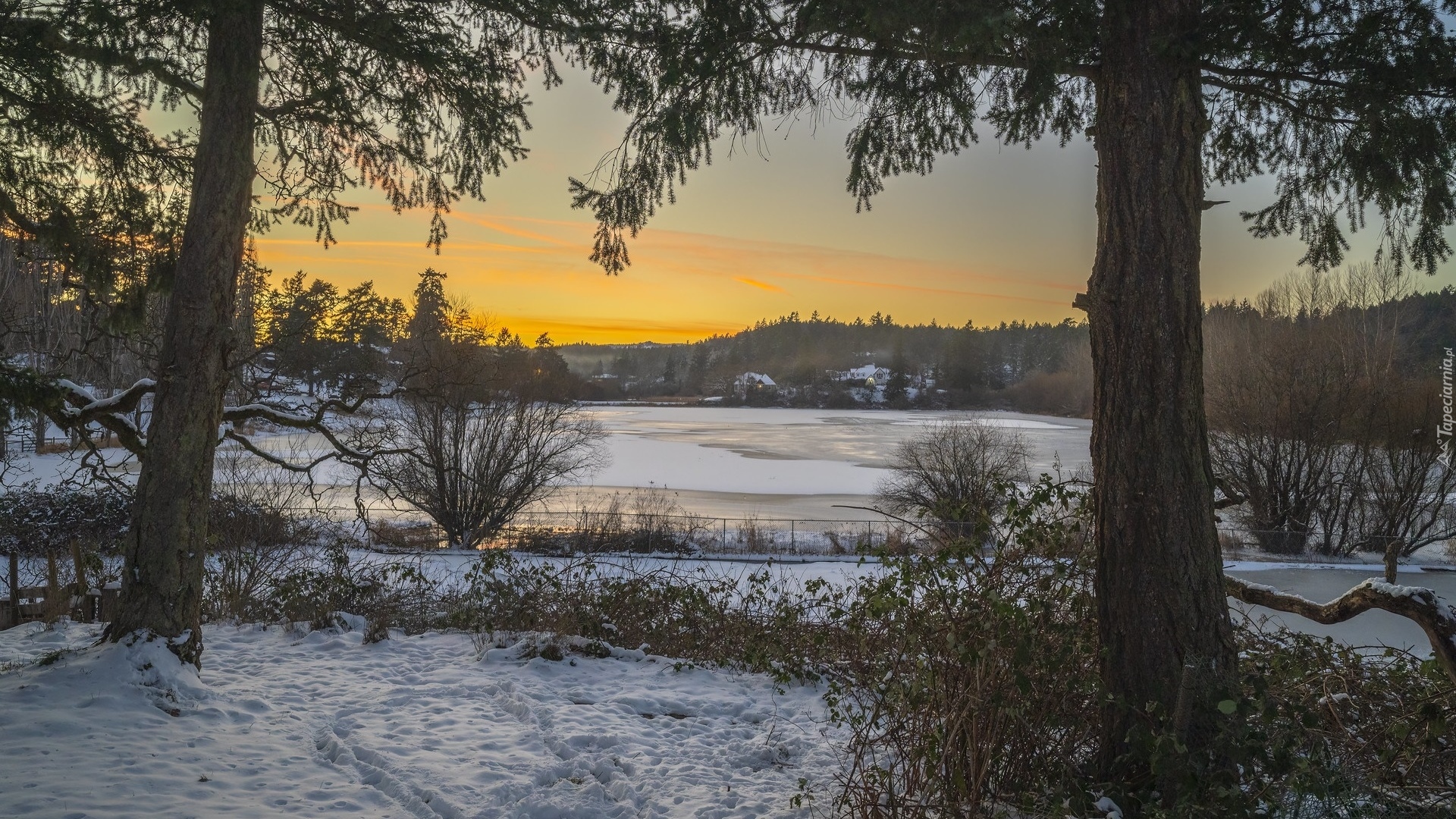 Edytor tapety: Widok zza drzew na zamarznięte zalane pole