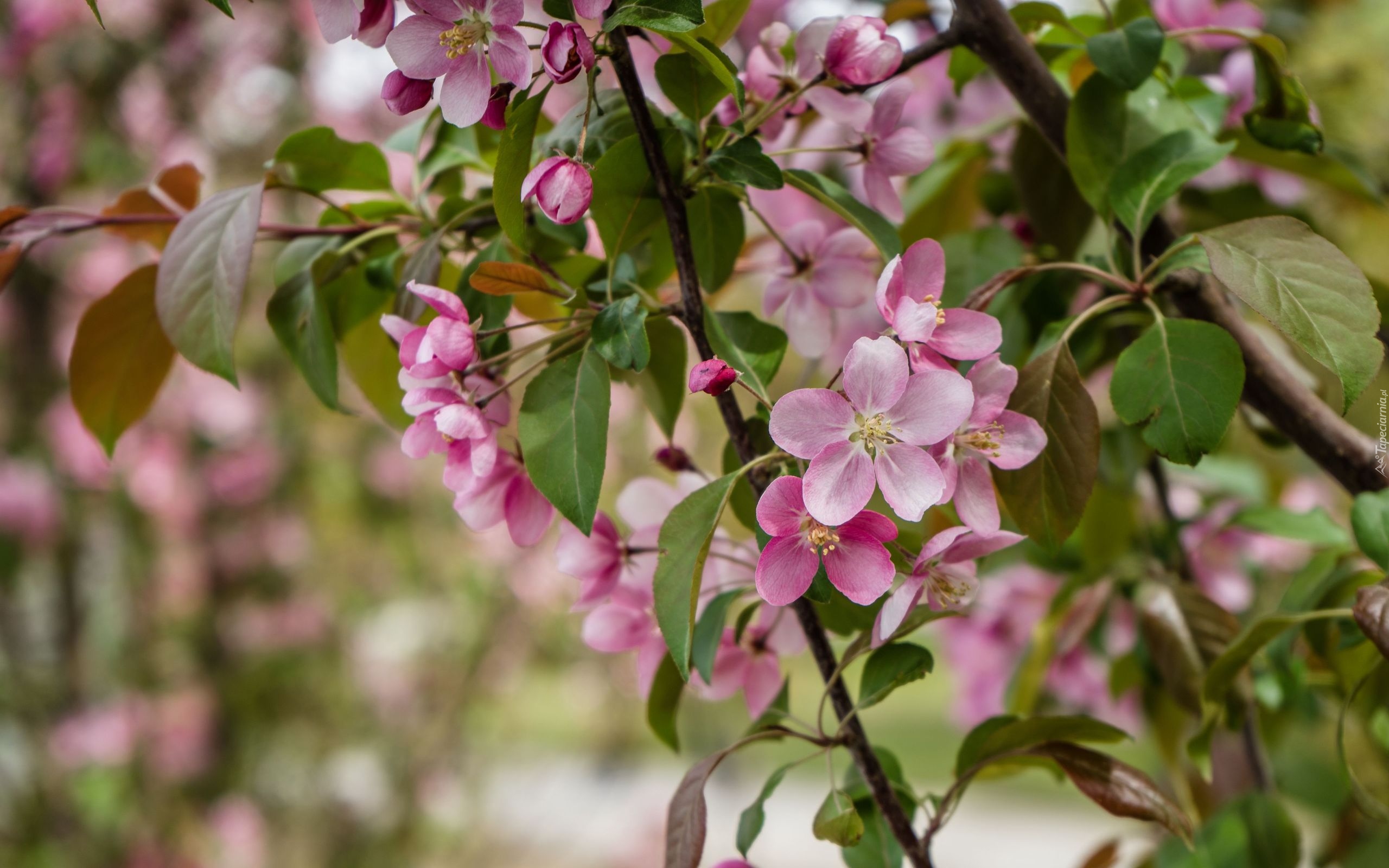 Edytor tapety: Gałązka z różowymi kwiatami i pąkami jabłoni