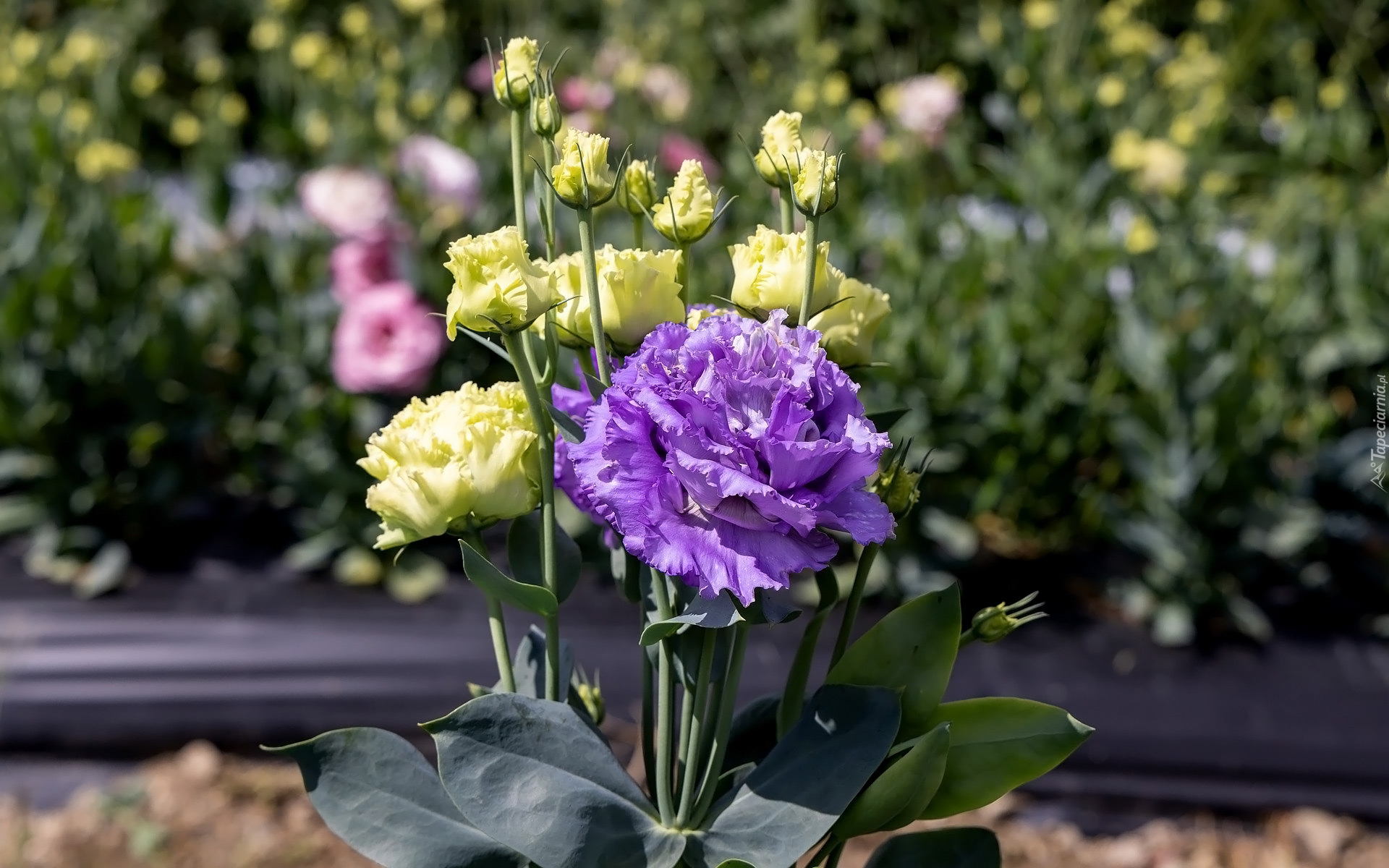 Edytor tapety: Fioletowa i żółta eustoma z liśćmi