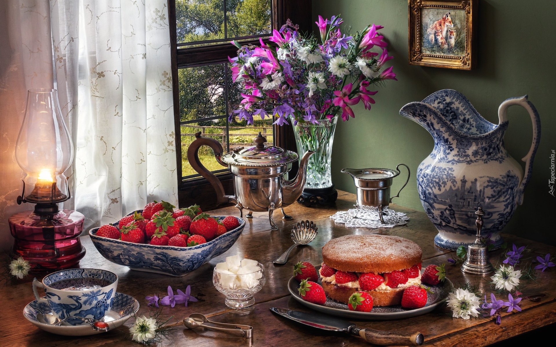 Edytor tapety: Truskawki i kwiaty w wazonie przy oknie