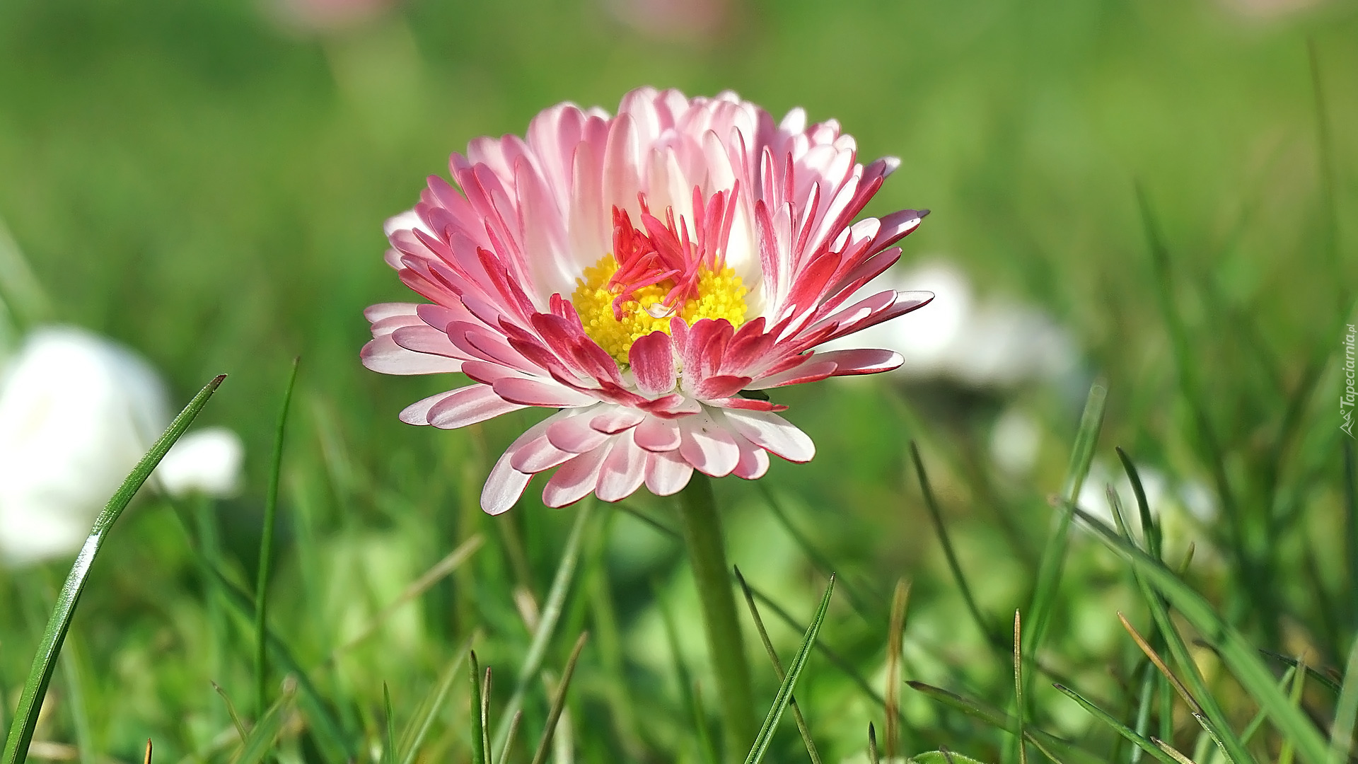 Edytor tapety: Kwiat biało-różowej stokrotki w trawie