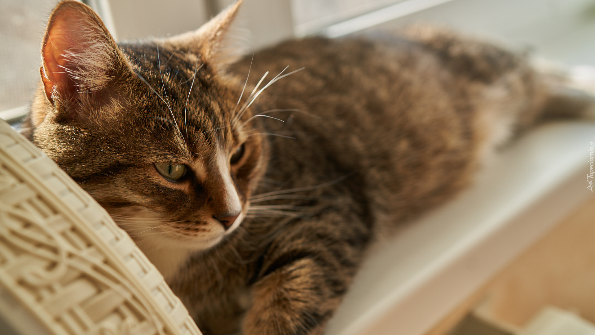 Edytor tapety: Szaro-bury kot leżący na parapecie