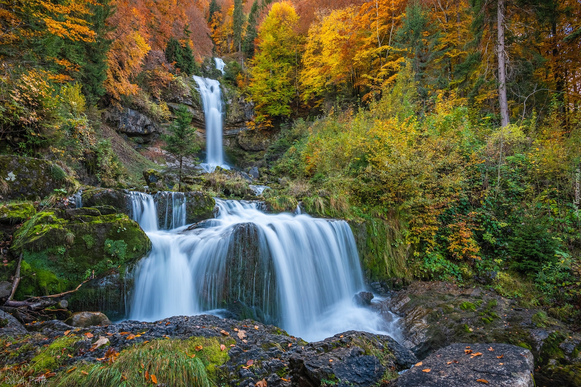 Edytor tapety: Wodospad na skałach otoczony jesiennymi drzewami