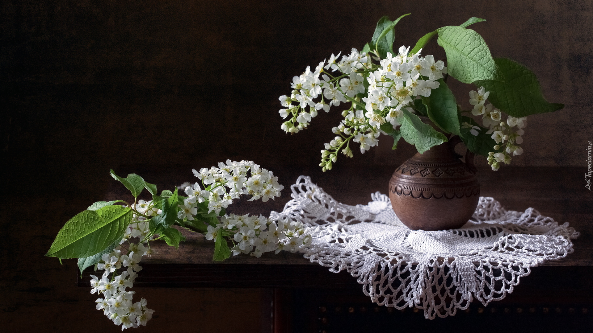 Edytor tapety: Gałązki kwitnącej czeremchy w glinianym dzbanku