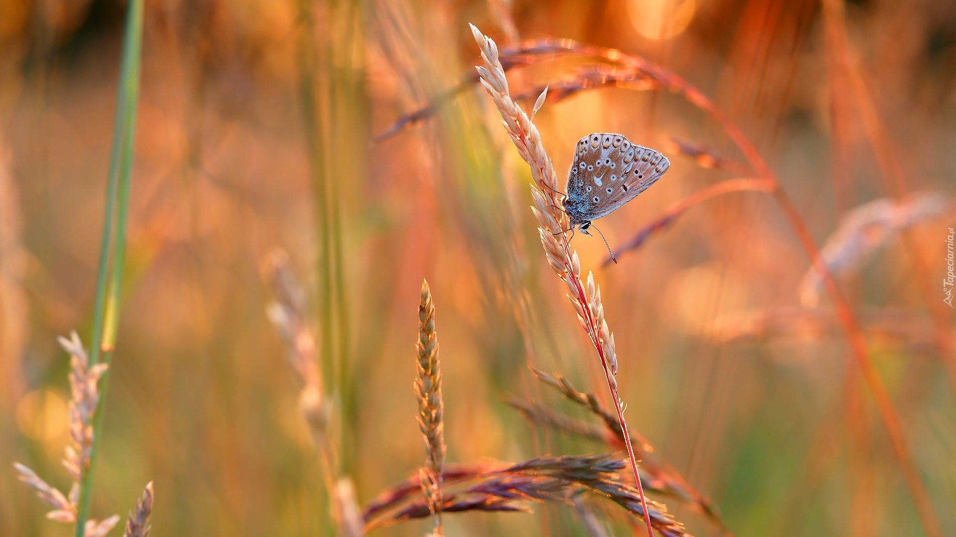 Edytor tapety: Modraszek ikar siedzący na źdźble trawy