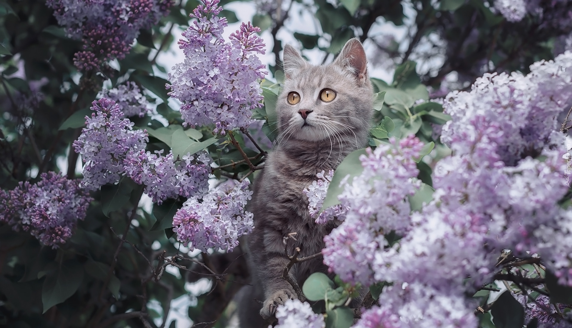 Edytor tapety: Bury kot na gałęzi kwitnącego bzu