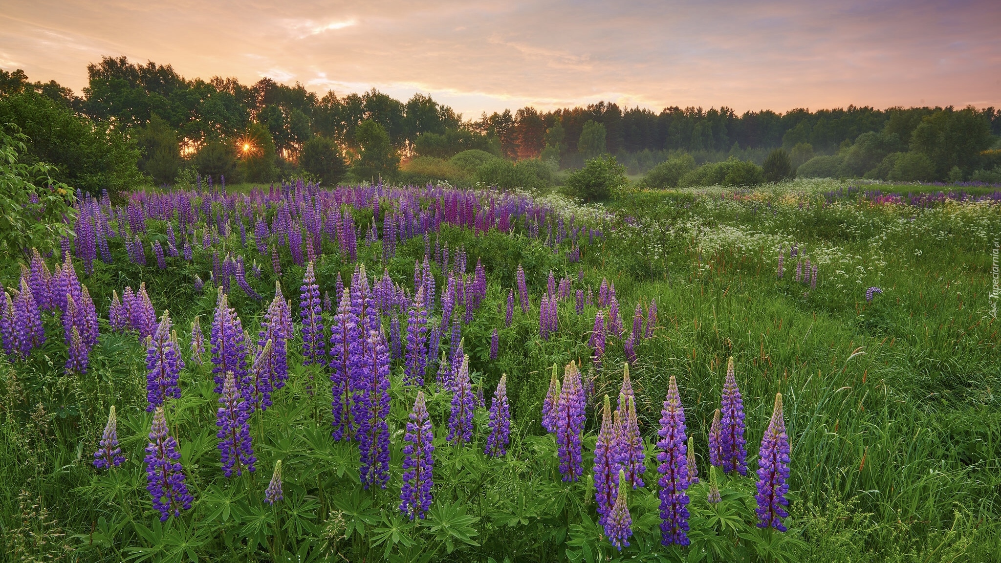 Edytor tapety: Łubiny na łące i drzewa w promieniach słońca