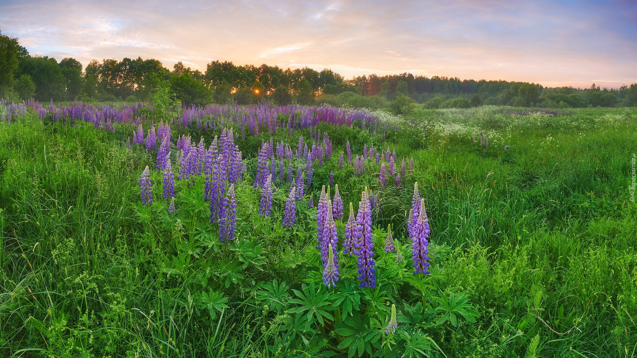 Edytor tapety: Fioletowe łubiny w wysokiej trawie