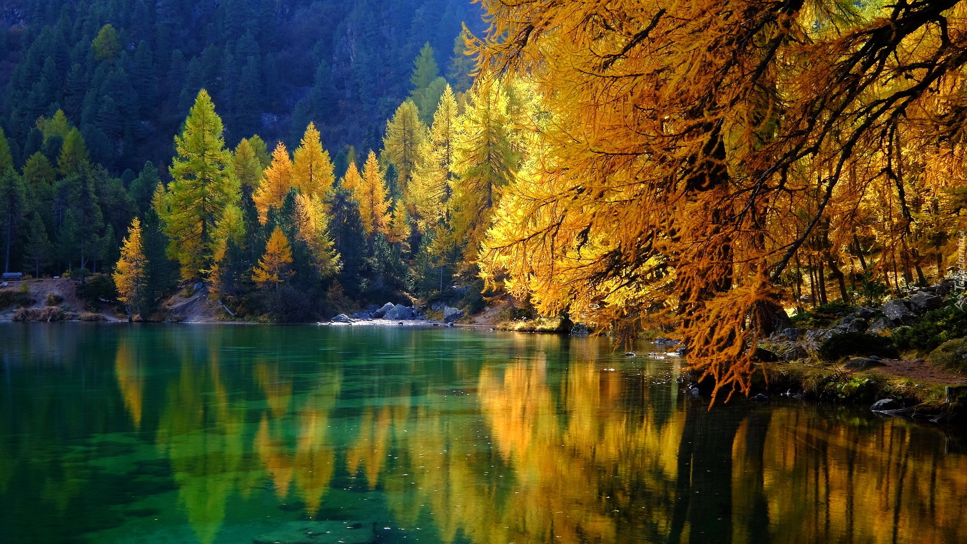 Edytor tapety: Pożółkłe drzewa nad jeziorem Lai da Palpuogna