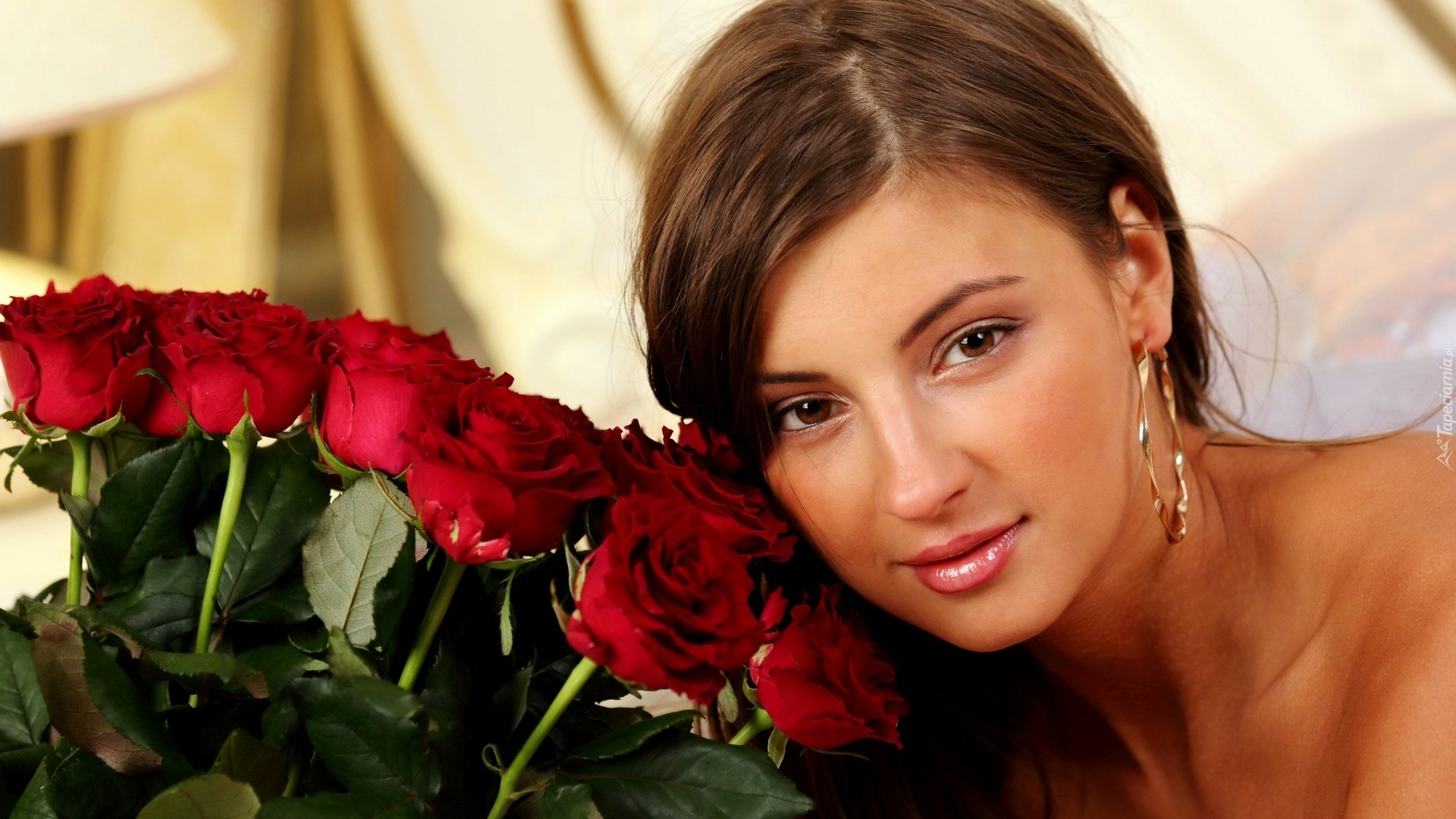 Edytor tapety: Kobieta z bukietem czerwonych róż