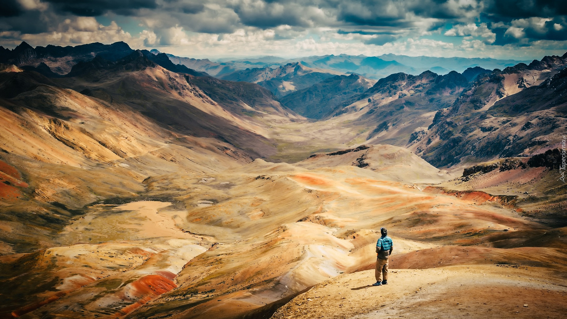 Edytor tapety: Człowiek na skałach w górskim wąwozie
