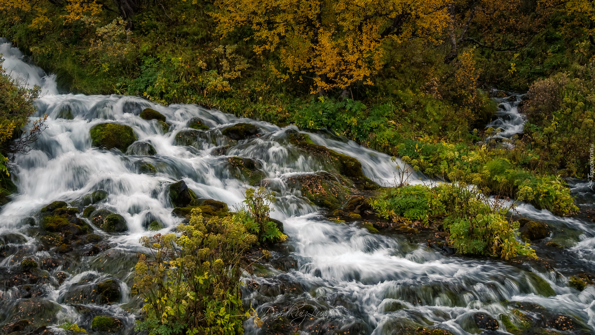 Edytor tapety: Pożółkłe krzewy nad rwącym potokiem
