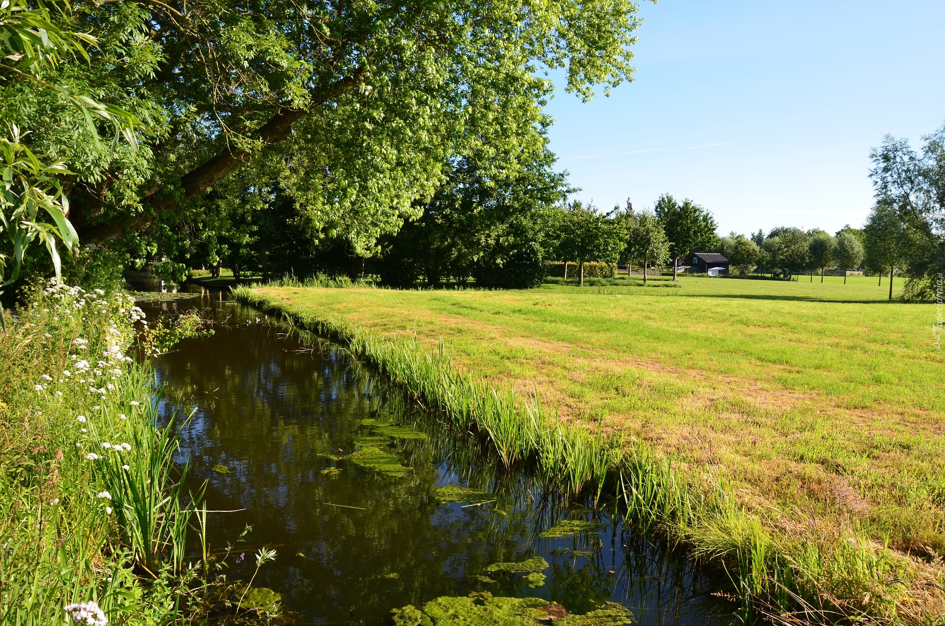 Edytor tapety: Rzeczka obok łąki i drzew