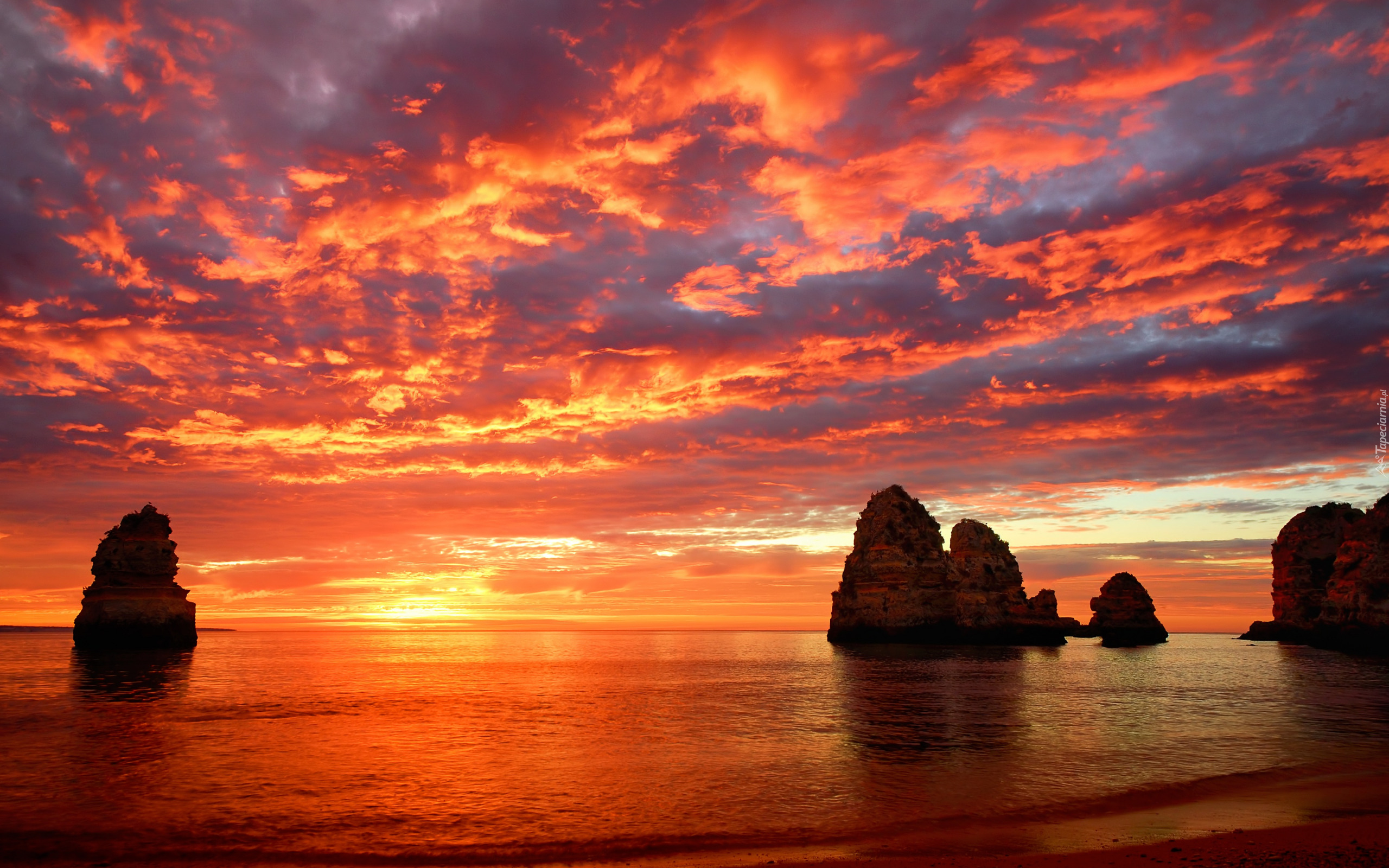 Edytor tapety: Kolorowe niebo zachodzącego słońca nad skałami w morzu