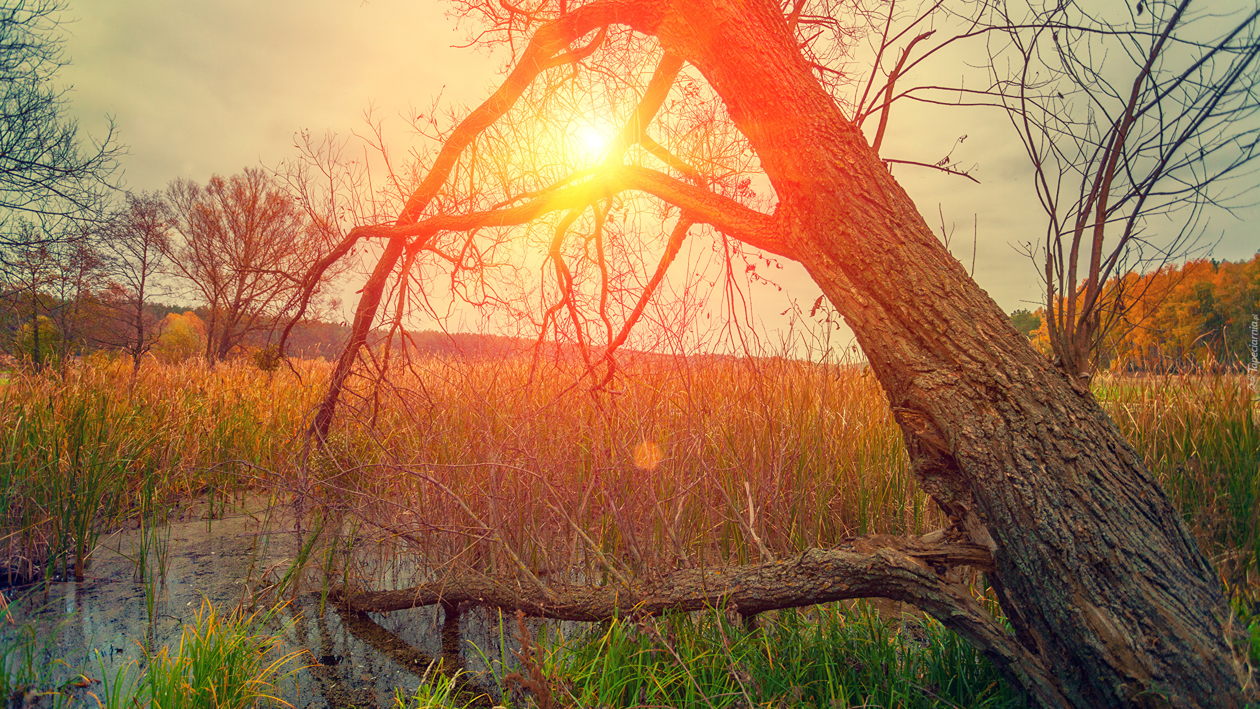 Edytor tapety: Słońce pomiędzy gałęziami drzewa pochylonego nad bagnem