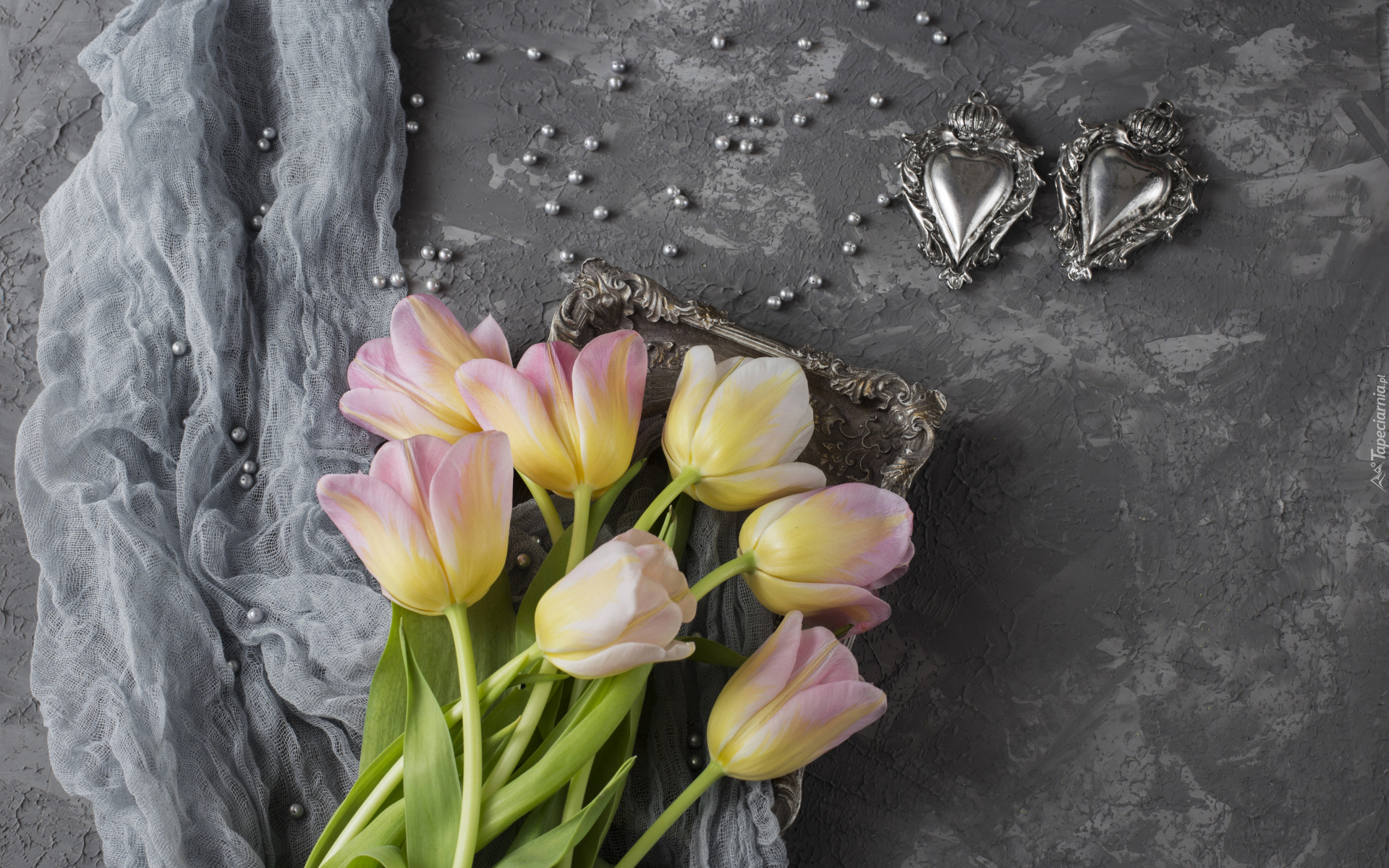 Edytor tapety: Dwa srebrne serduszka obok tulipanów na srebrnej tacy