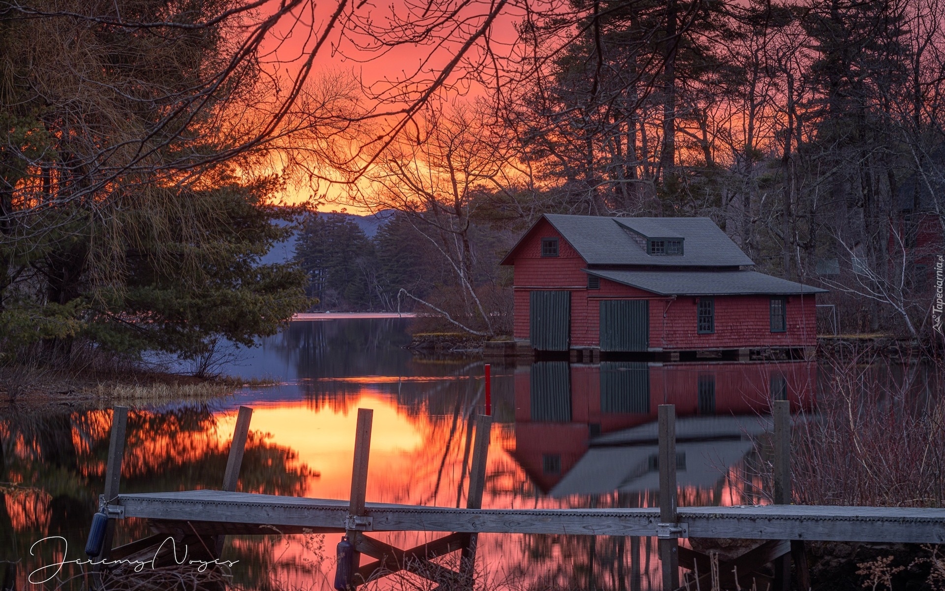 Edytor tapety: Dom i pomost nad jeziorem o zachodzie słońca