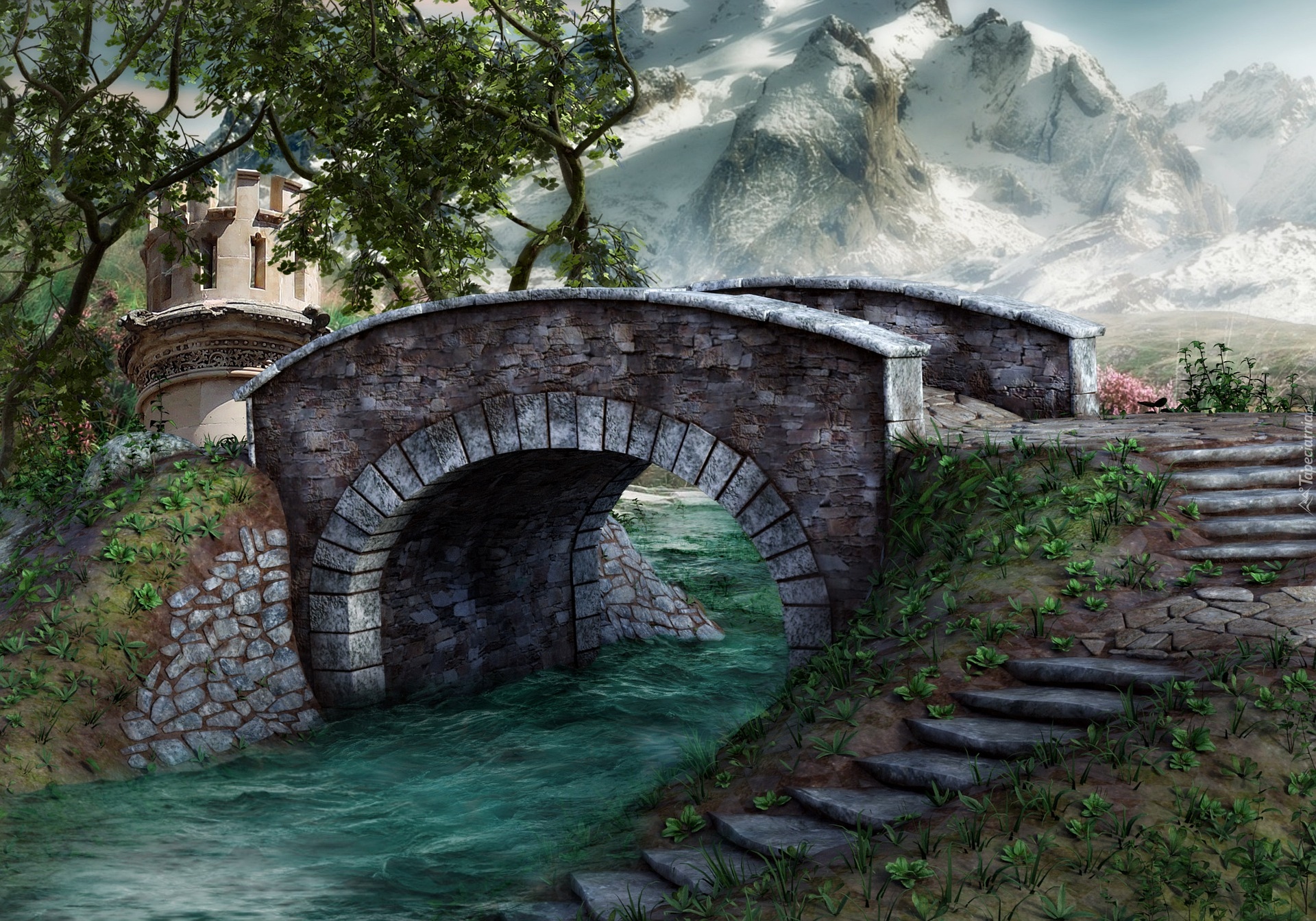 Edytor tapety: Schody i kamienny most nad rzeką