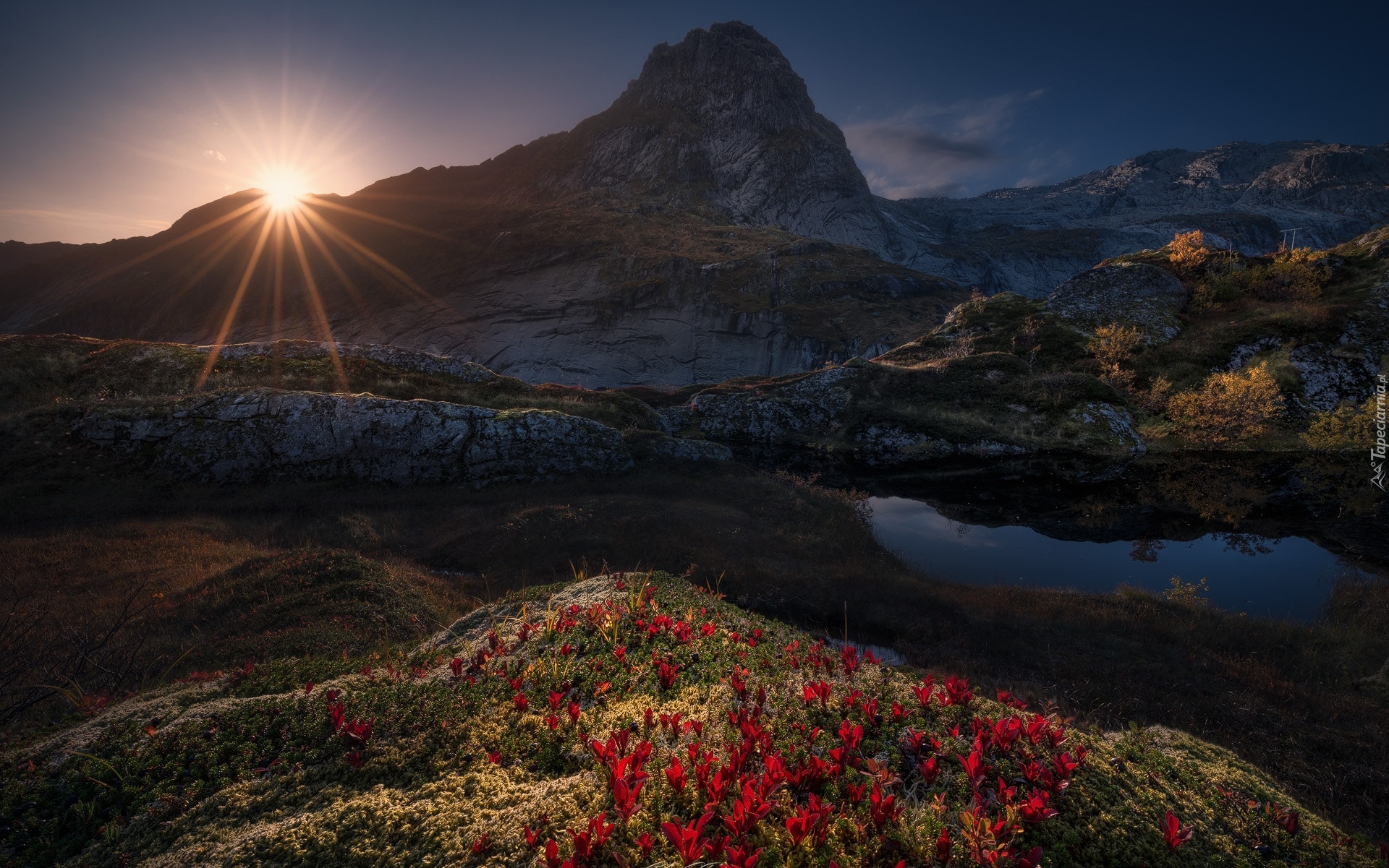 Edytor tapety: Rozświetlone czerwone kwiaty i góry na Lofotach
