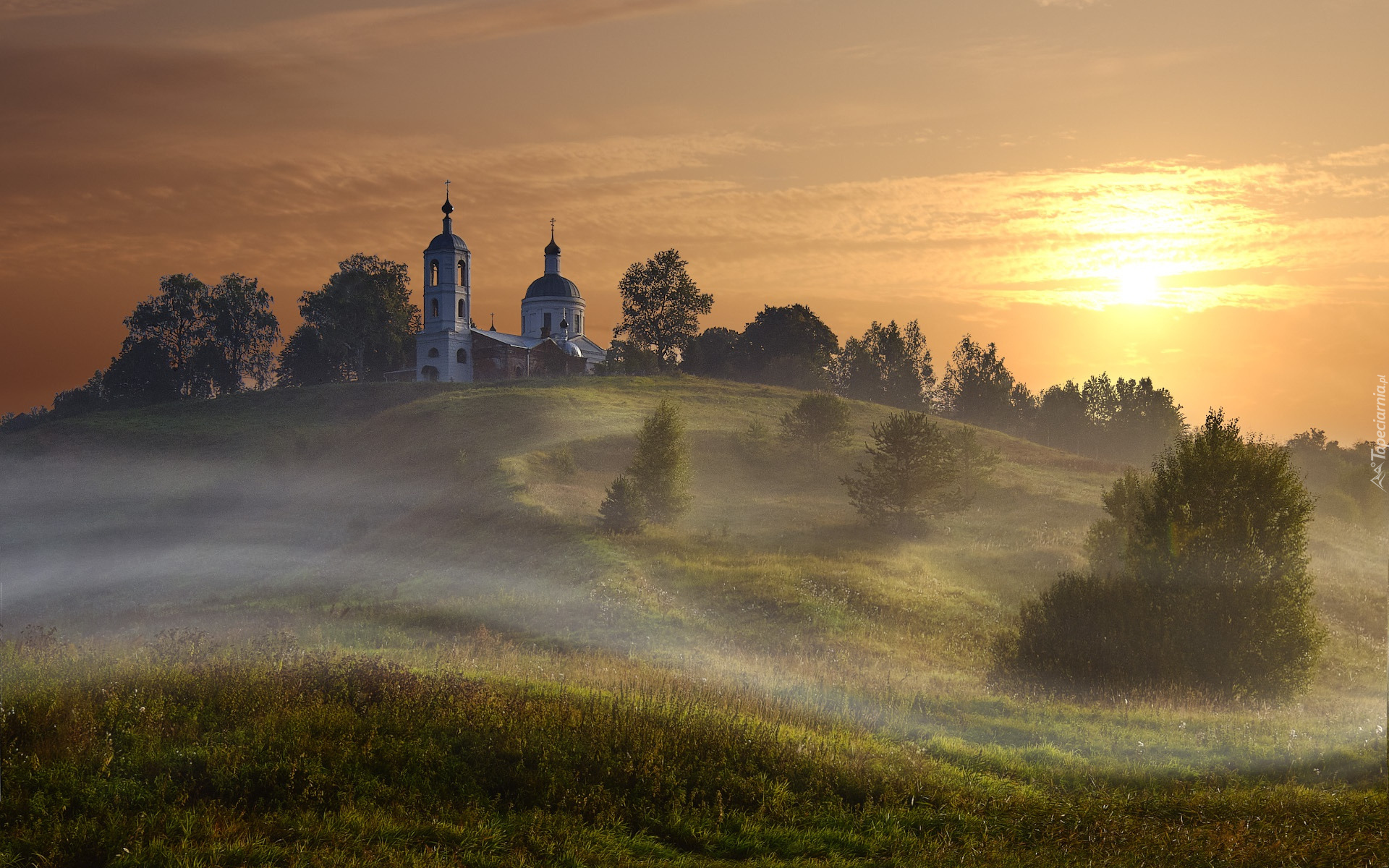 Edytor tapety: Poranna mgła nad łąką i cerkwią na wzgórzu