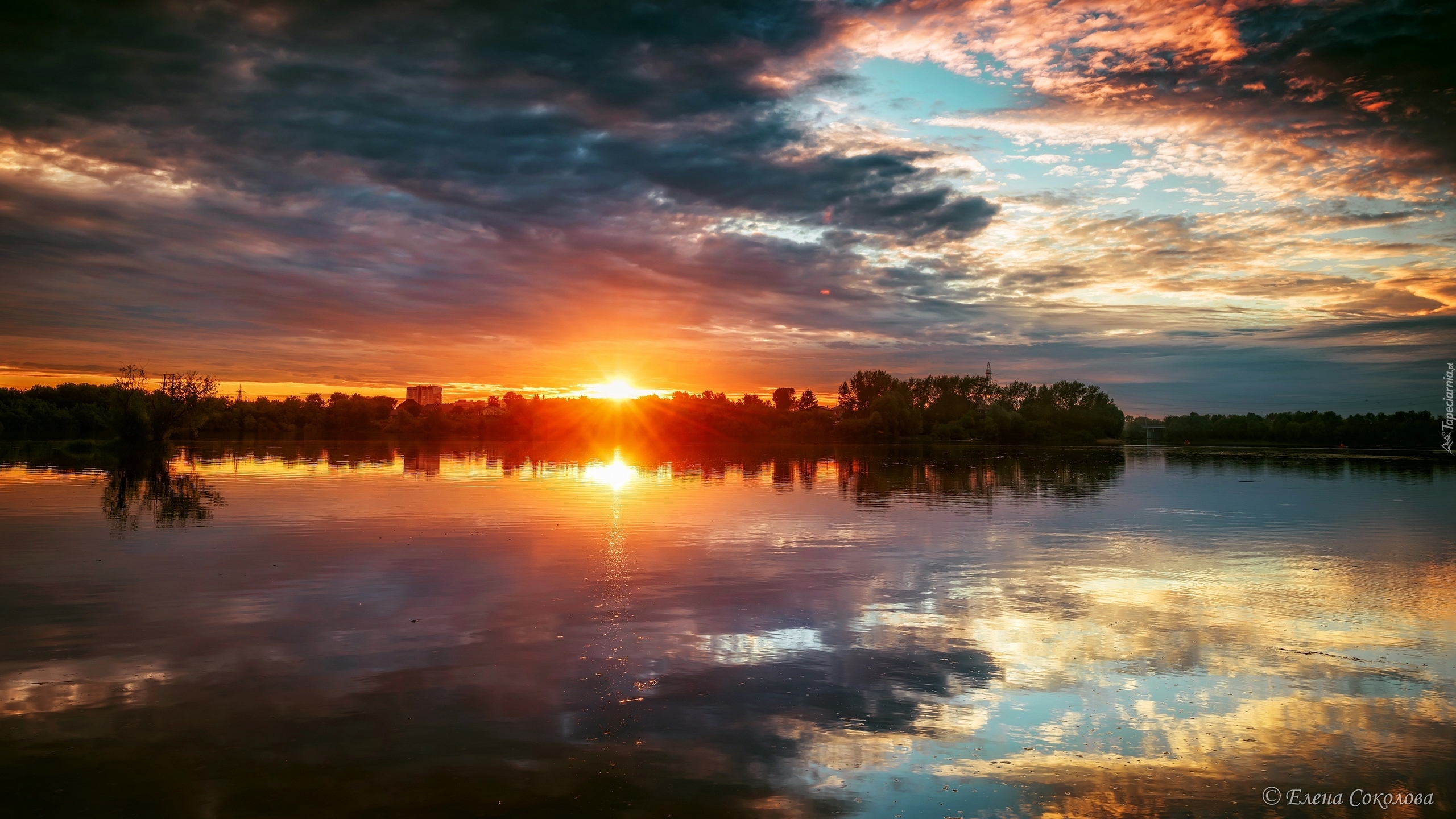 Edytor tapety: Jezioro w blasku zachodzącego słońca pod ciemnymi chmurami