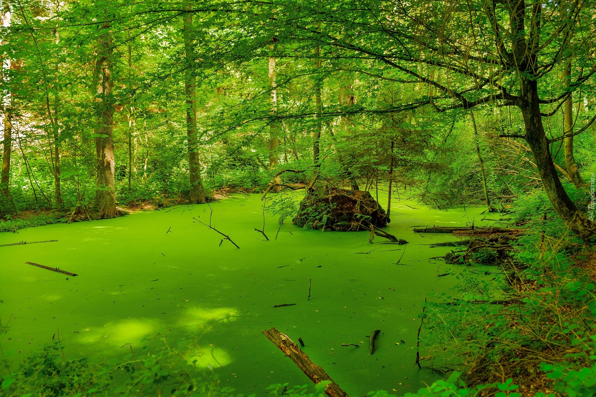 Edytor tapety: Staw pokryty glonami w lesie
