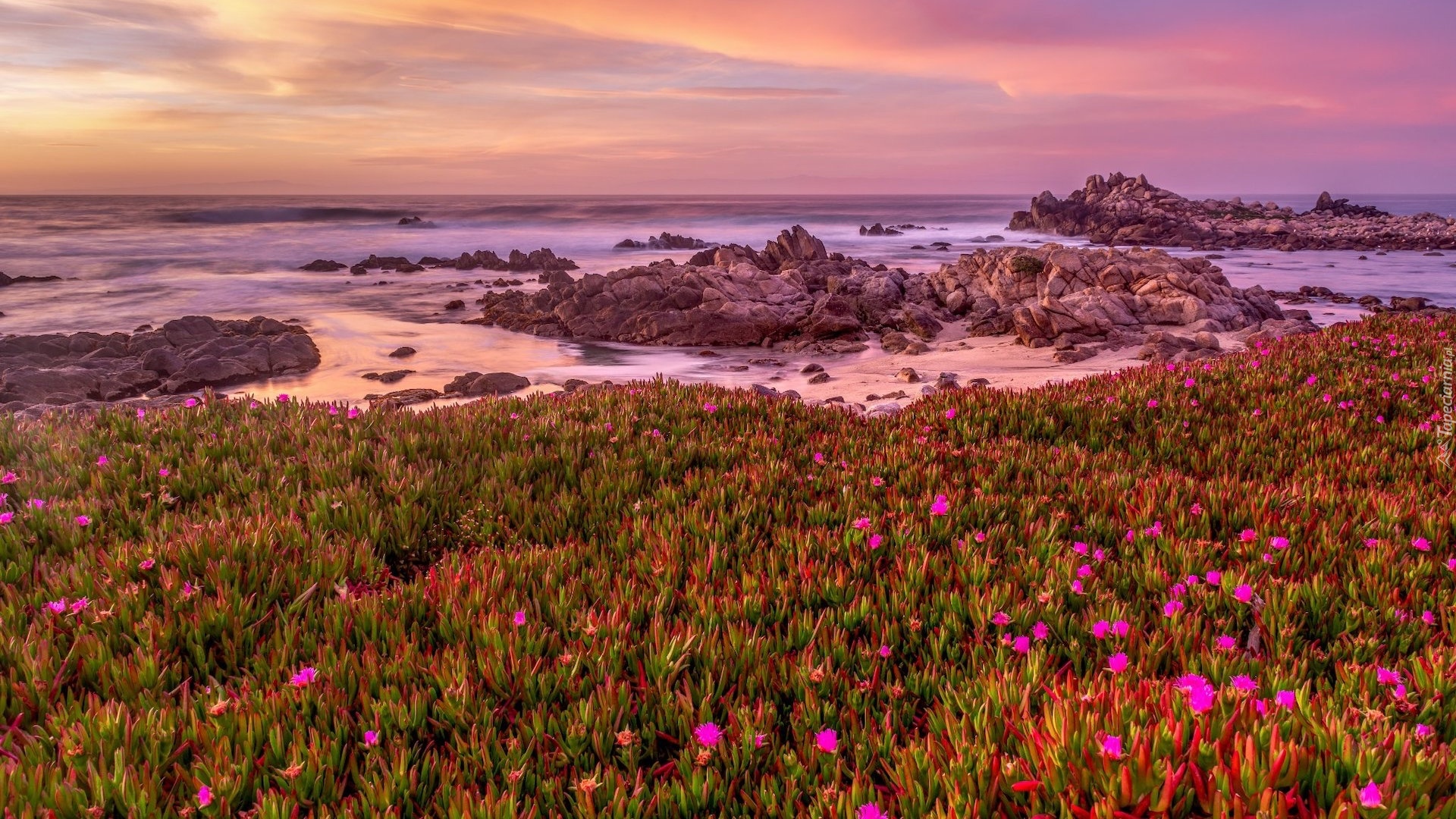 Edytor tapety: Fioletowe kwiaty i skały na morskim wybrzeżu