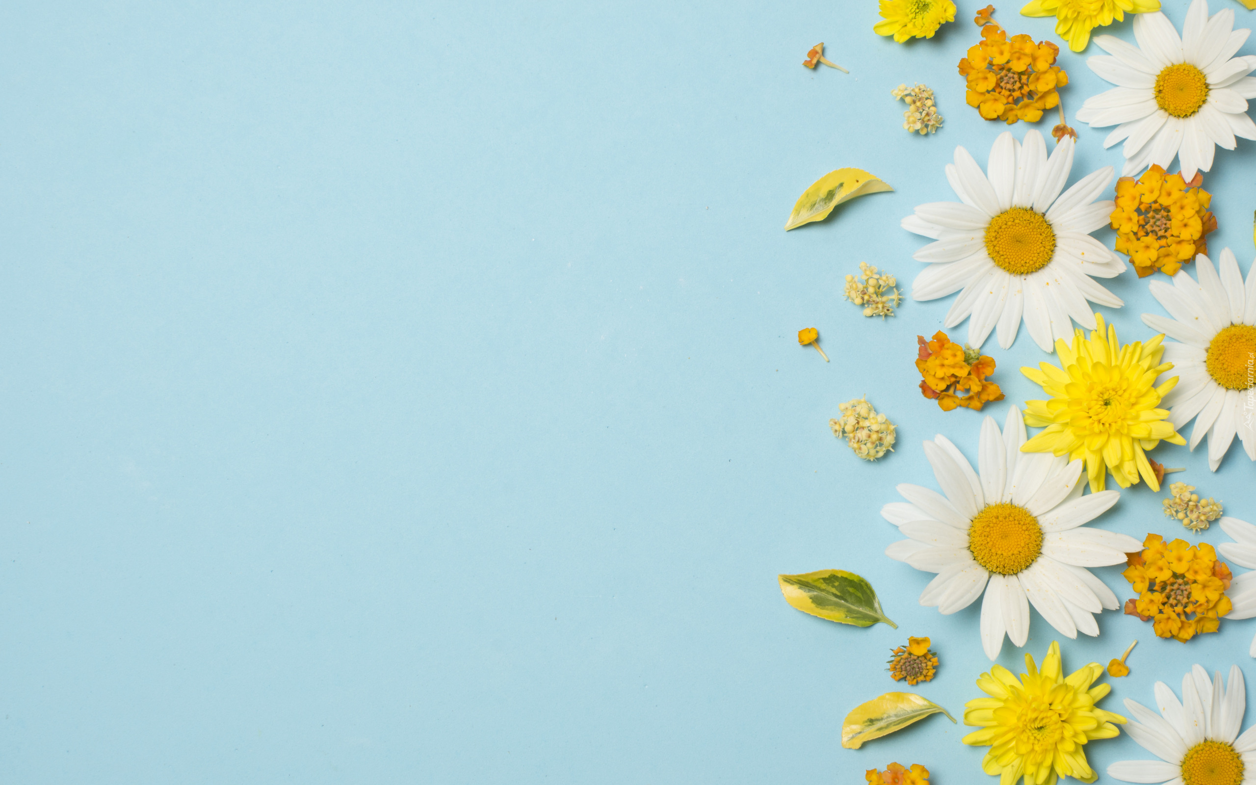 Edytor tapety: Białe i żółte kwiaty na niebieskim tle