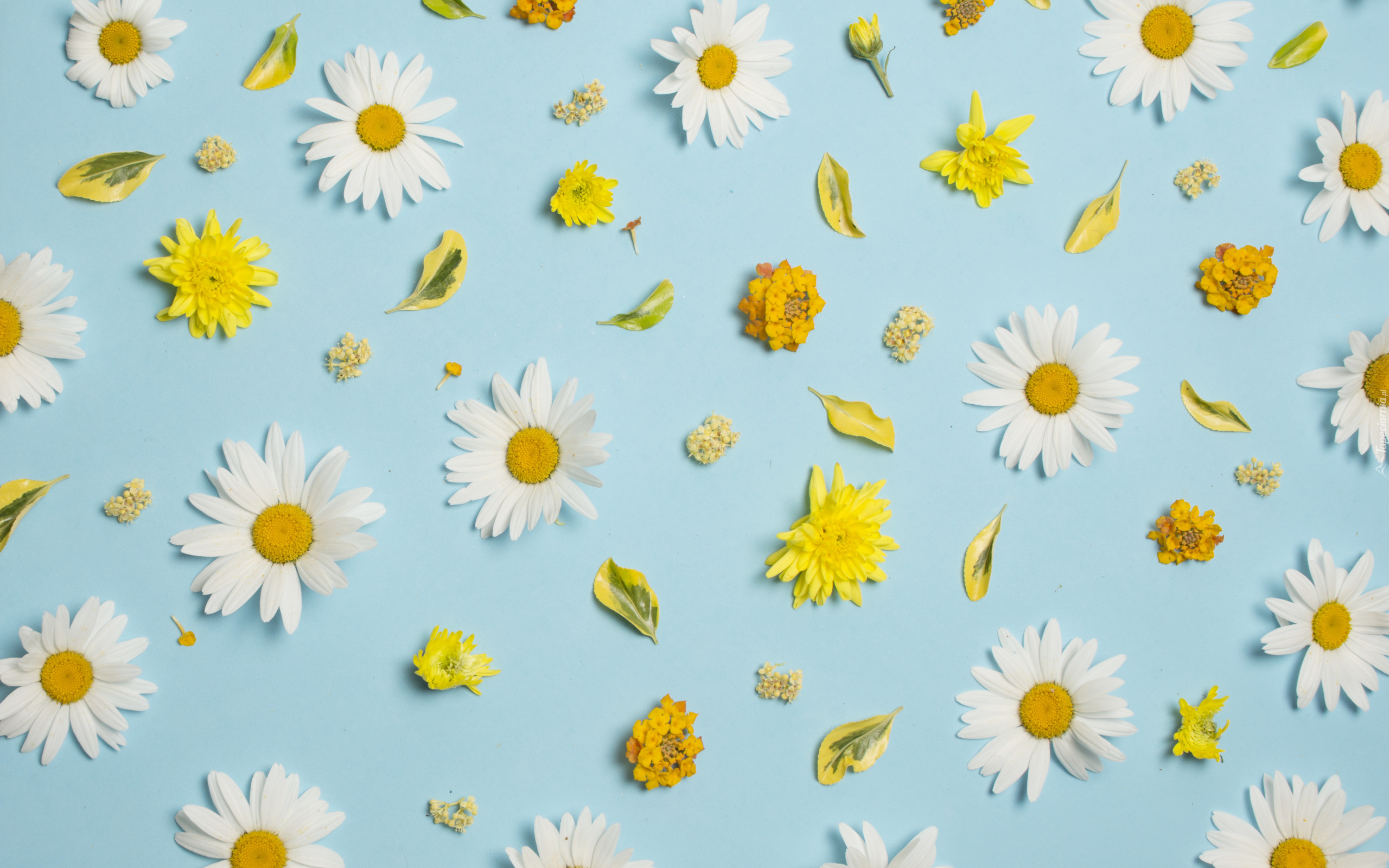Edytor tapety: Rozrzucone kwiaty na niebieskim tle