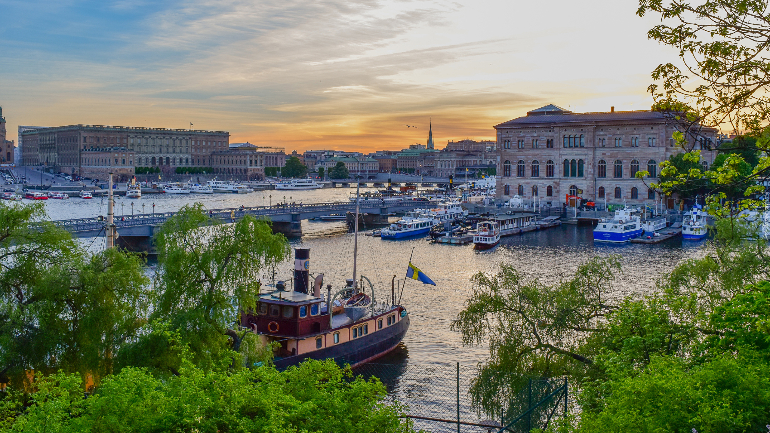 Edytor tapety: Statki i domy nad rzeką w Sztokholmie