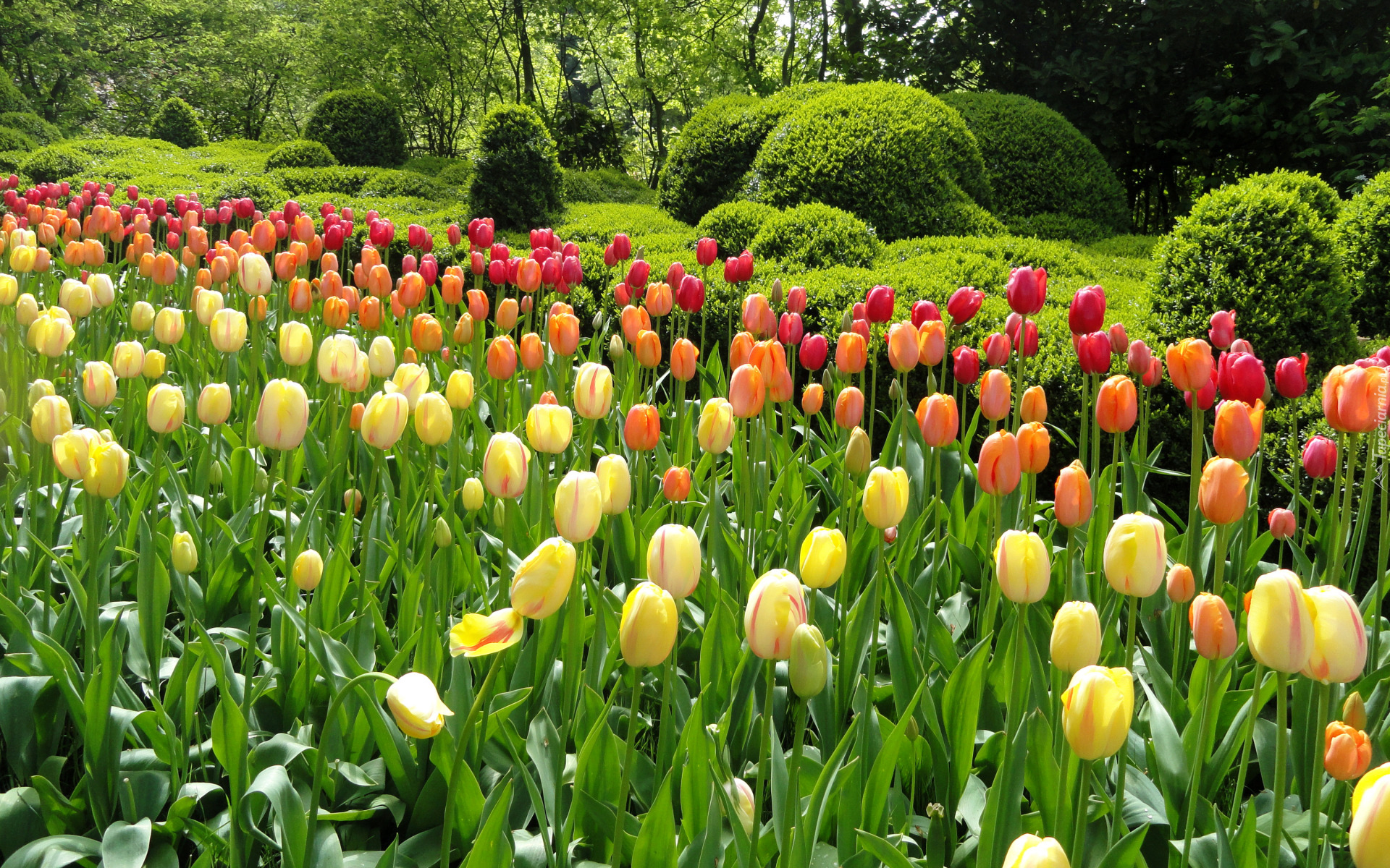 Edytor tapety: Krzewy i rabaty kolorowych tulipanów w parku