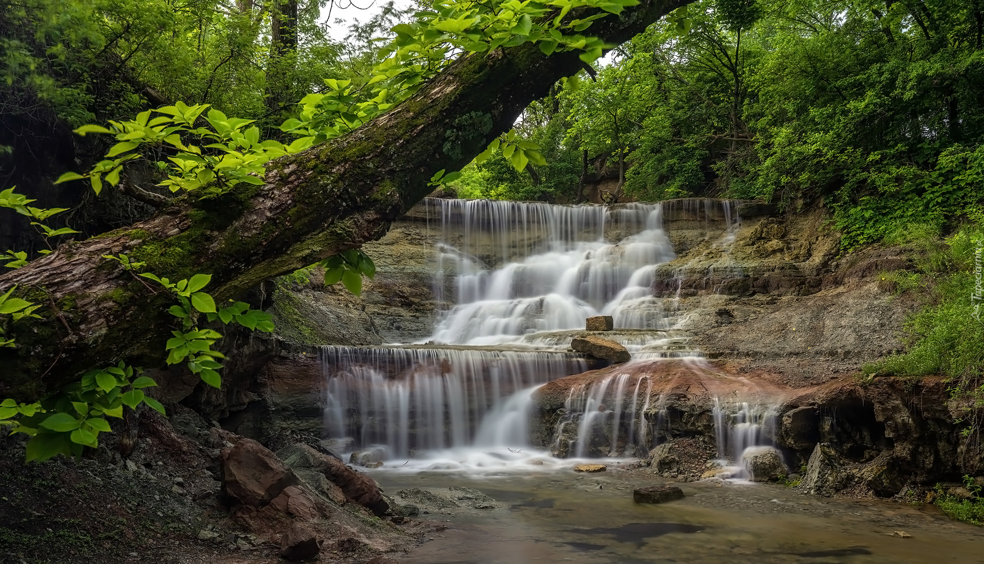 Edytor tapety: Pochylone drzewo nad rzeką i wodospad w tle