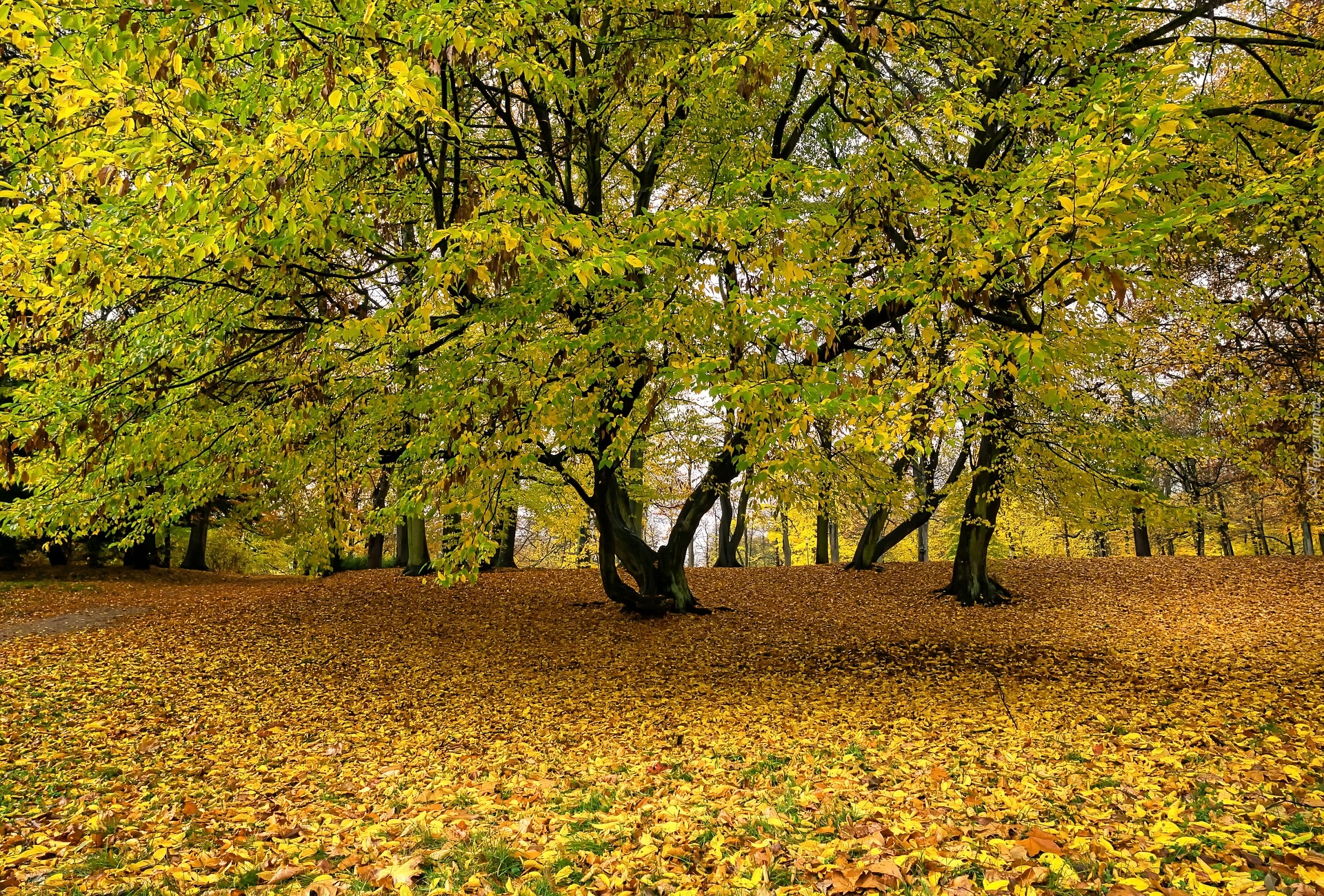 Edytor tapety: Opadłe jesienne liście pod drzewami w parku