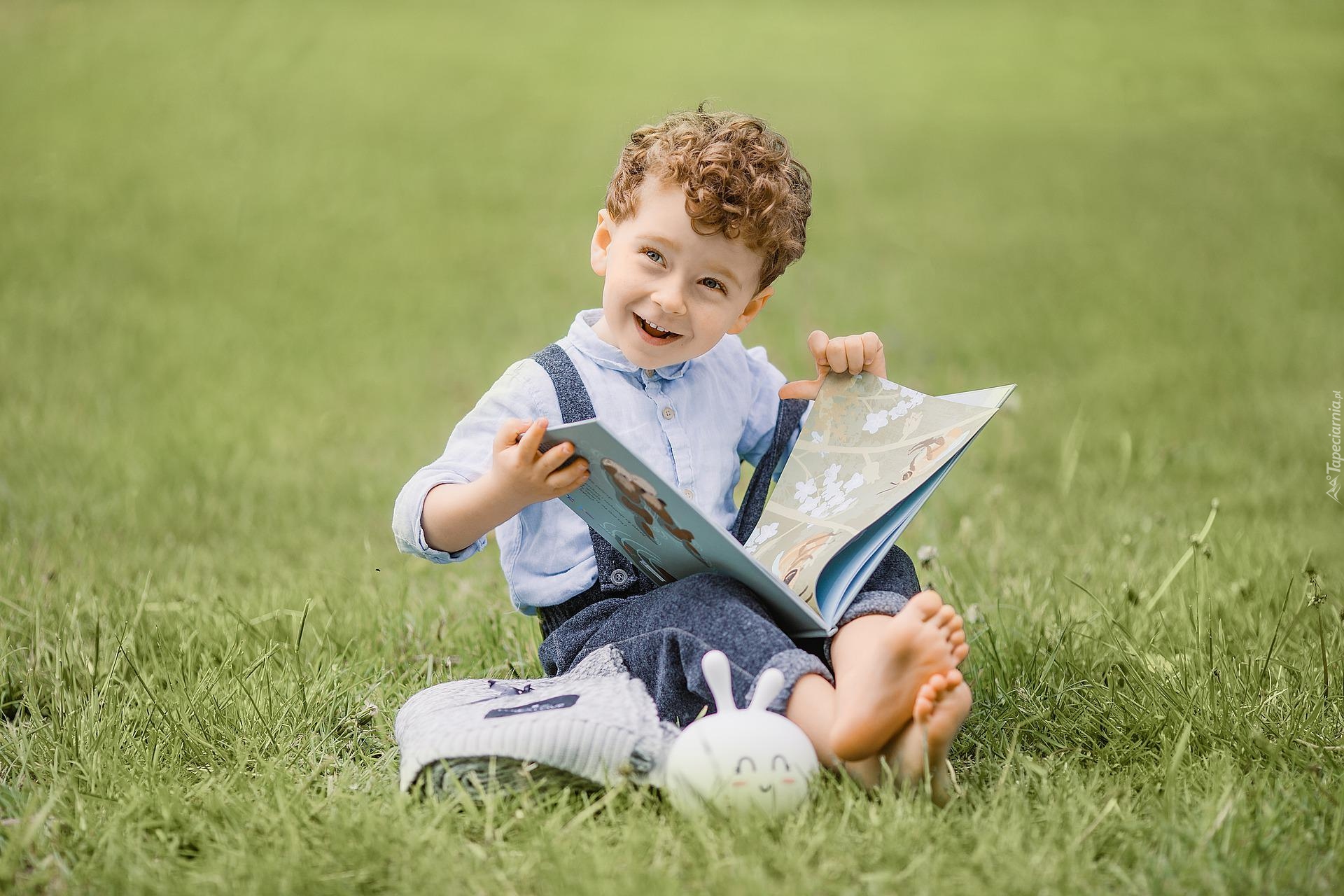 Edytor tapety: Siedzący na trawie chłopczyk z otwartą książką