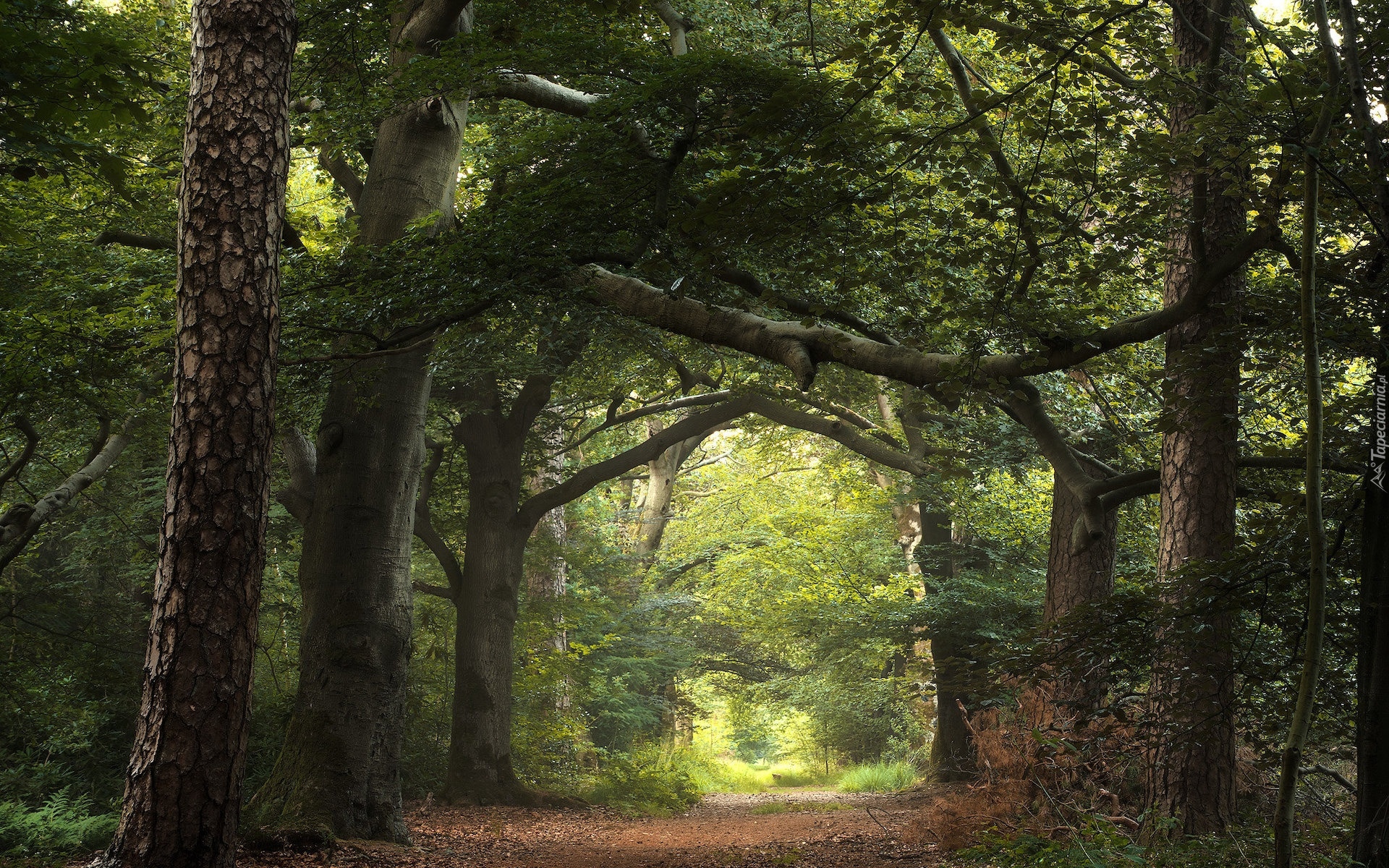 Edytor tapety: Rozświetlona droga pomiędzy zielonymi drzewami