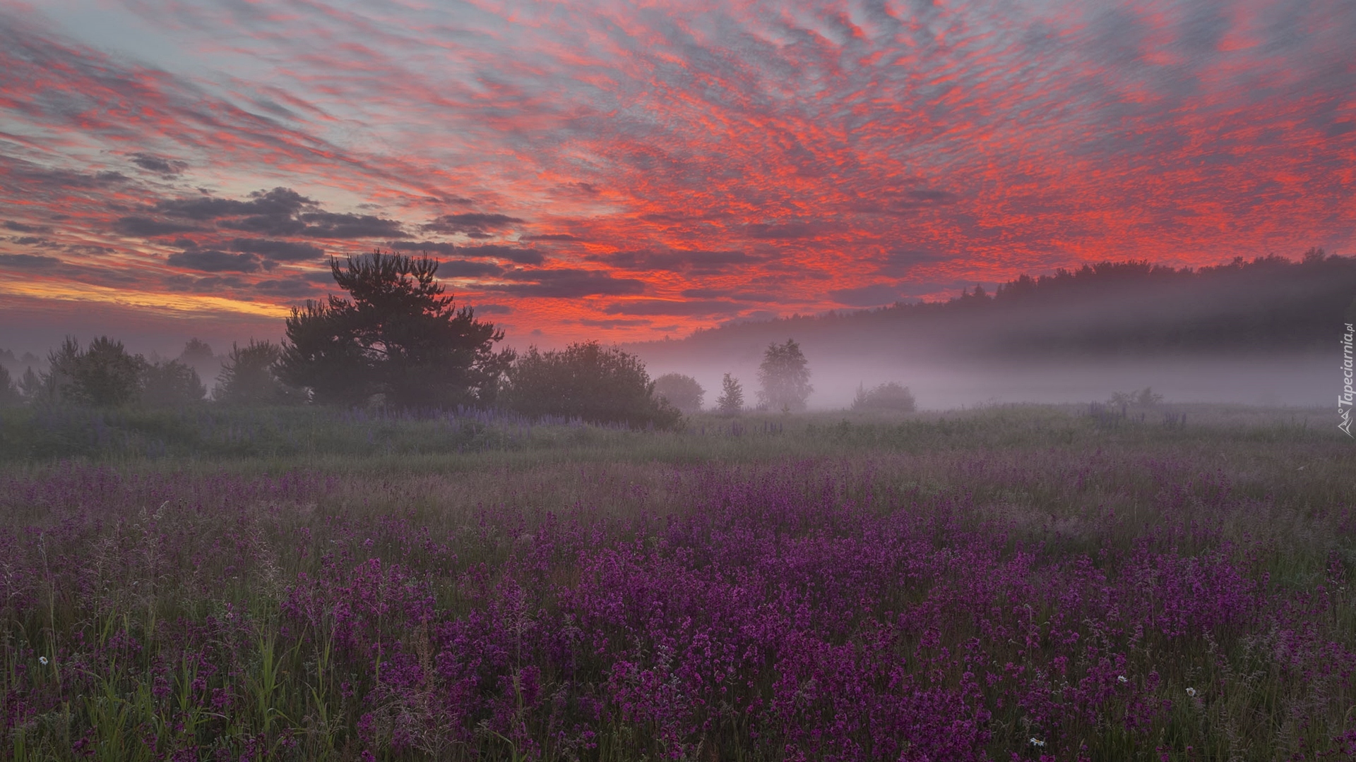 Edytor tapety: Zamglona łąka pod kolorowym niebem
