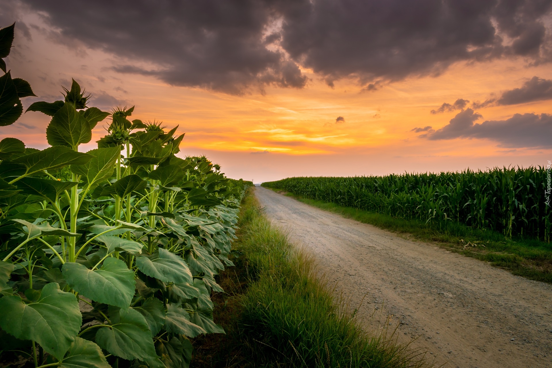 Edytor tapety: Droga przez pole słoneczników i kukurydzy