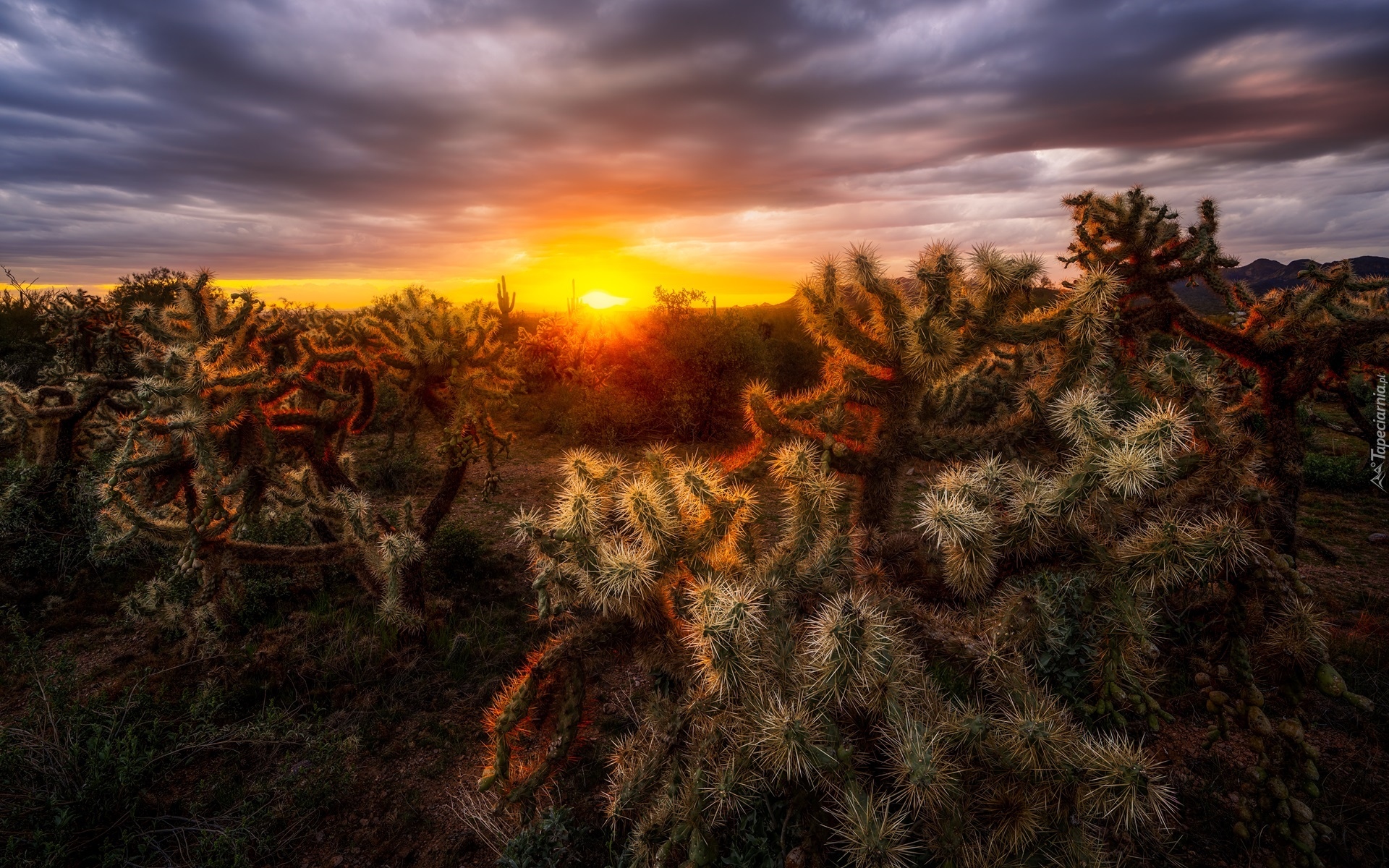 Edytor tapety: Kaktusy w blasku zachodzącego słońca