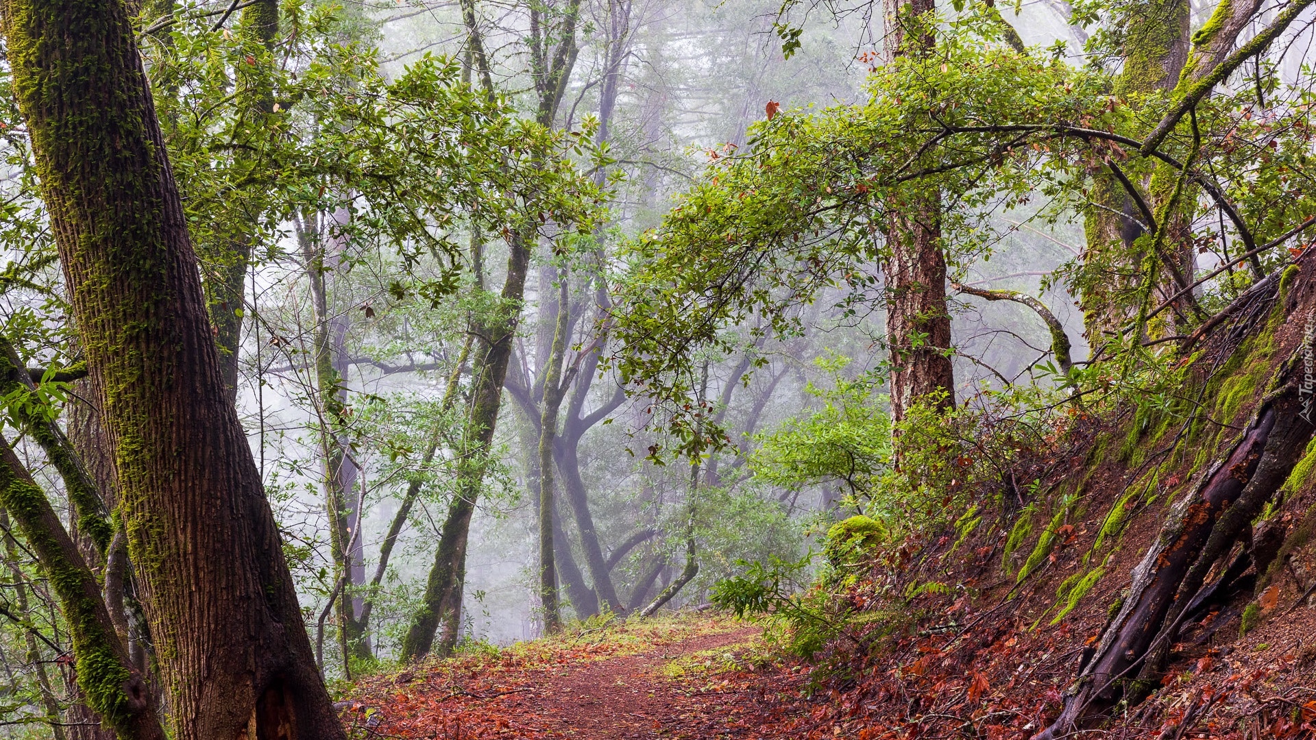 Edytor tapety: Drzewa na skarpie w zamglonym lesie