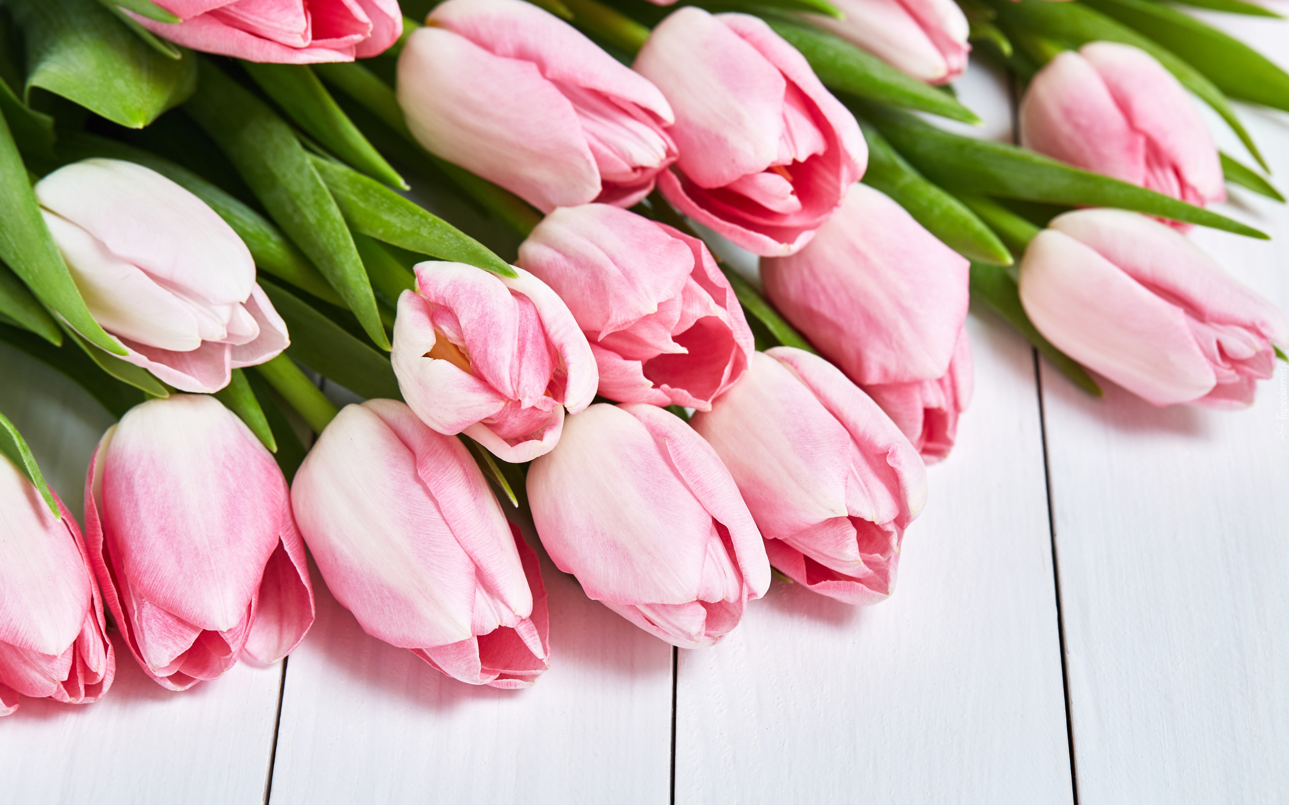 Edytor tapety: Różowe tulipany w bukiecie na deskach