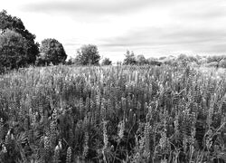 Edytor tapety: Łubiny i drzewa pod zachmurzonym niebem