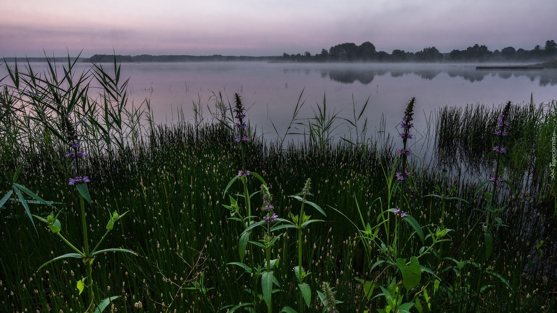 Edytor tapety: Widok zza traw na jezioro o poranku