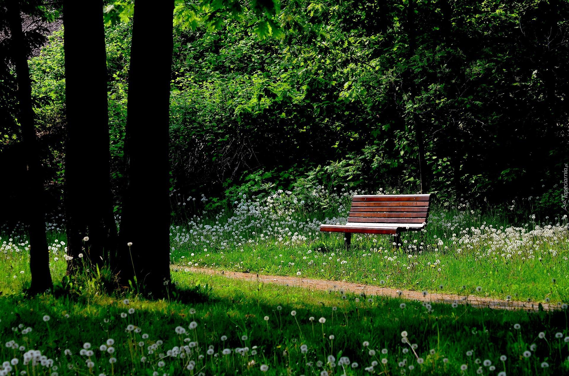 Edytor tapety: Ławka przy ścieżce pod drzewami